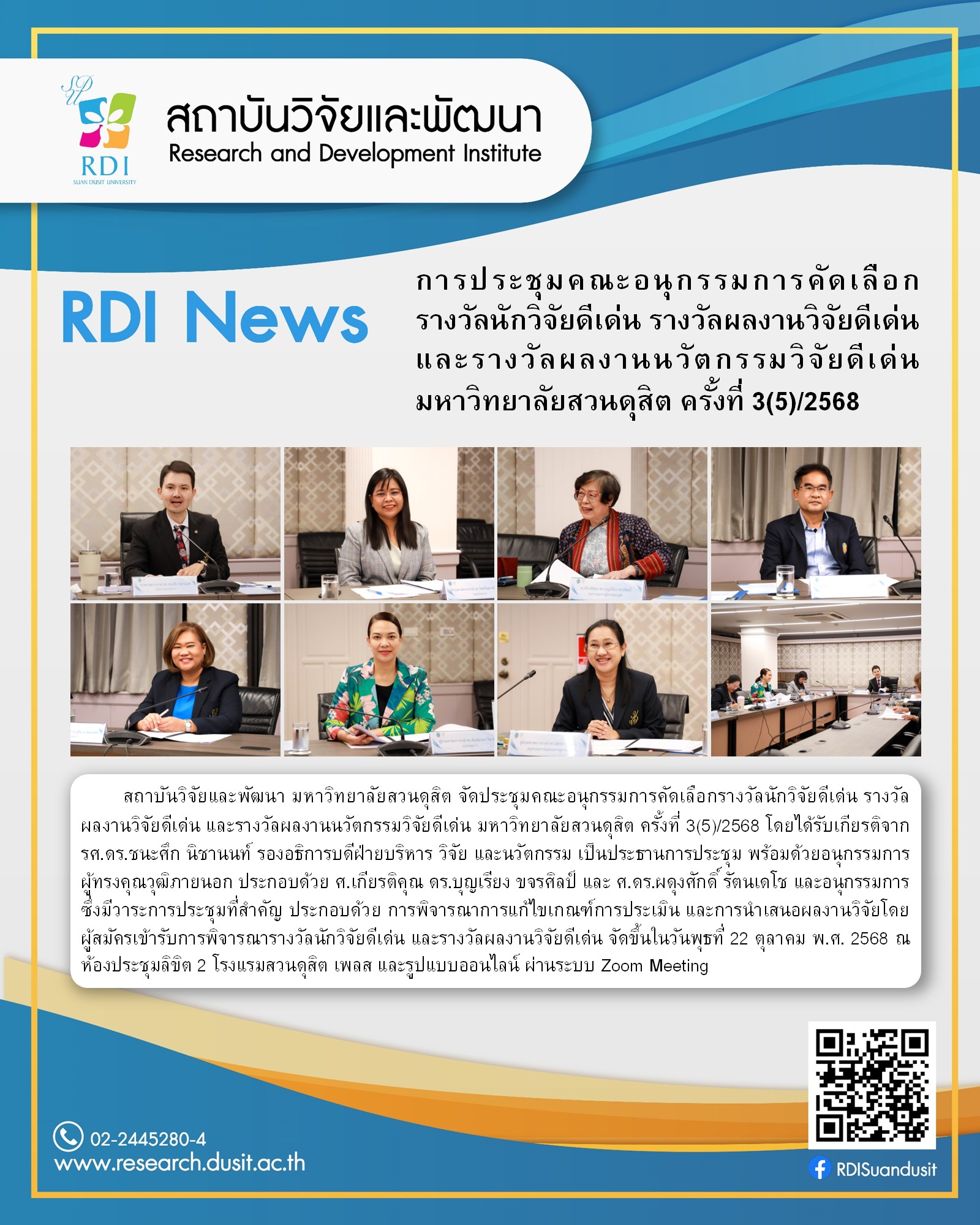 การประชุมคณะอนุกรรมการคัดเลือกรางวัลนักวิจัยดีเด่น รางวัลผลงานวิจัยดีเด่น และรางวัลผลงานนวัตกรรมวิจัยดีเด่น มหาวิทยาลัยสวนดุสิต ครั้งที่ 3(5)/2568