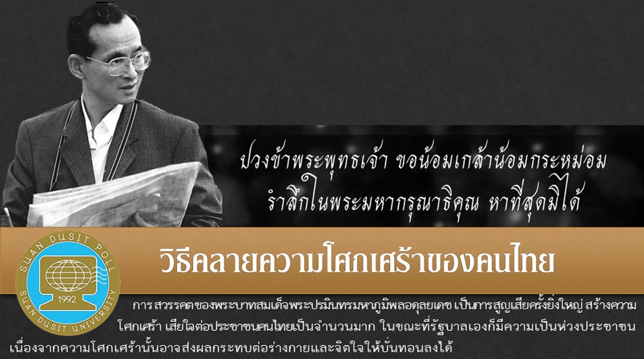 การสวรรคตของพระบาทสมเด็จพระปรมินทรมหาภูมิพลอดุลยเดช รัชกาลที่ 9 นับเป็นความสูญเสียครั้งยิ่งใหญ่ของประเทศไทย สร้างความโศกเศร้าให้แก่ประชาชนเป็นจำนวนมาก “สวนดุสิตโพล” จึงได้สำรวจความคิดเห็นของประชาชนจำนวน 1,337 คน ระหว่างวันที่ 1–9 ธันวาคม 2559 เพื่อสะท้อนวิธีคลายความโศกเศร้าในช่วงเวลาแห่งการสูญเสีย ผลสำรวจพบว่าประชาชนเลือกวิธีทางจิตใจ เช่น การสวดมนต์ นั่งสมาธิ ศึกษาธรรมะ และการทำบุญมากที่สุด รองลงมาคือการทำกิจกรรมจิตอาสา ยึดหลักคำสอนของพระองค์ การรับชมสื่อเทิดพระเกียรติ และการเดินทางตามรอยโครงการพระราชดำริ นอกจากนี้ ประชาชนยังตั้งใจอธิษฐานขอเป็นข้ารองพระบาททุกชาติ ขอให้พระองค์เสด็จสู่สวรรคาลัย และขอสืบสานพระราชปณิธานผ่านการทำความดี ตั้งใจเรียน ทำงาน และดูแลครอบครัว ผลสำรวจนี้สะท้อนถึงความรัก ความผูกพัน และการน้อมนำแนวทางแห่งคุณธรรมของในหลวง ร.9 มาเป็นแบบอย่างในการดำเนินชีวิตอย่างแท้จริง