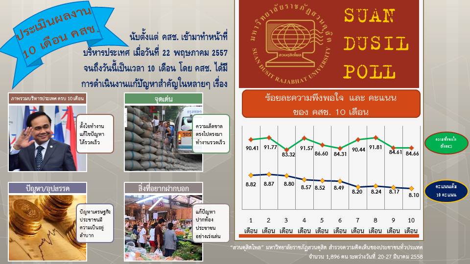 สวนดุสิตโพล มหาวิทยาลัยราชภัฏสวนดุสิต ได้สำรวจความคิดเห็นประชาชนทั่วประเทศจำนวน 1,896 คน ระหว่างวันที่ 20–27 มีนาคม 2558 เพื่อประเมิน “ผลการดำเนินงาน 10 เดือนของคณะรักษาความสงบแห่งชาติ (คสช.)” พบว่า ประชาชนส่วนใหญ่เห็นว่าคสช.มีความตั้งใจในการทำงาน และสามารถแก้ปัญหาบางด้านได้อย่างรวดเร็ว (82.44%) แต่ยังมีบางปัญหาที่ยังไม่สามารถแก้ไขได้ จุดเด่นของคสช. ได้แก่ ความเด็ดขาด การปราบปรามคอร์รัปชัน และการส่งเสริมการท่องเที่ยว ส่วนอุปสรรคสำคัญคือภาวะเศรษฐกิจตกต่ำ และความยากของการปฏิรูปการเมือง ประชาชนส่วนใหญ่ฝากให้คสช.เร่งแก้ไขปัญหาค่าครองชีพ รับฟังความเห็นจากทุกฝ่าย และใช้งบประมาณอย่างคุ้มค่า ด้านความพึงพอใจ พบว่า 55.85% ค่อนข้างพึงพอใจ และ 28.81% พึงพอใจมาก โดยให้เหตุผลว่าคสช.ทำงานตามนโยบายอย่างเป็นระบบ แต่คะแนนความนิยมโดยรวมลดลงจาก 8.82 ในเดือนแรก เหลือ 8.10 คะแนนในเดือนที่สิบ สะท้อนความเปลี่ยนแปลงของความรู้สึกประชาชนต่อการบริหารงานของคสช.ในช่วงเวลาดังกล่าว