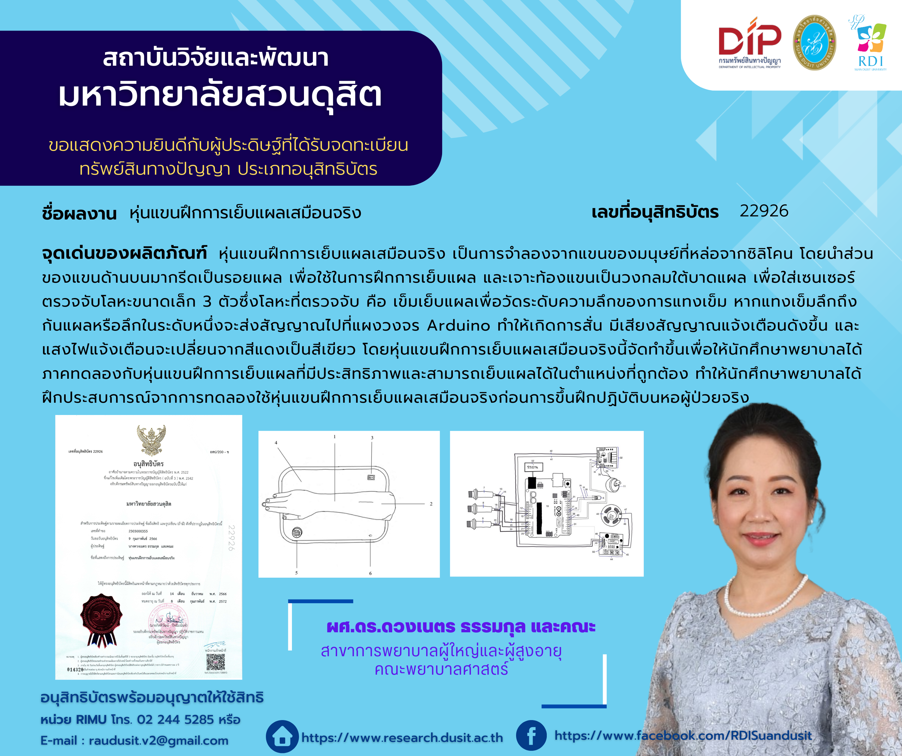 จุดเด่นของผลิตภัณฑ์ หุ่นแขนฝึกการเย็บแผลเสมือนจริง เป็นการจำลองจากแขนของมนุษย์ที่หล่อจากซิลิโคน โดยนำส่วน ของแขนด้านบนมากรีดเป็นรอยแผล เพื่อใช้ในการฝึกการเย็บแผล และเจาะท้องแขนเป็นวงกลมใต้บาดแผล เพื่อใส่เซนเซอร์ ตรวจจับโลหะขนาดเล็ก 3 ตัวซึ่งโลหะที่ตรวจจับ คือ เข็มเย็บแผลเพื่อวัดระดับความลึกของการแทงเข็ม หากแทงเข็มลึกถึง ก้นแผลหรือลึกในระดับหนึ่งจะส่งสัญญาณไปที่แผงวงจร Arduino ทำให้เกิดการสั่น มีเสียงสัญญาณแจ้งเตือนดังขึ้น และ แสงไฟแจ้งเตือนจะเปลี่ยนจากสีแดงเป็นสีเขียว โดยหุ่นแขนฝึกการเย็บแผลเสมือนจริงนี้จัดทำขึ้นเพื่อให้นักศึกษาพยาบาลได้ ภาคทดลองกับหุ่นแขนฝึกการเย็บแผลที่มีประสิทธิภาพและสามารถเย็บแผลได้ในตำแหน่งที่ถูกต้อง ทำให้นักศึกษาพยาบาลได้ ฝึกประสบการณ์จากการทดลองใช้หุ่นแขนฝึกการเย็บแผลเสมือนจริงก่อนการขึ้นฝึกปฏิบัติบนหอผู้ป่วยจริง