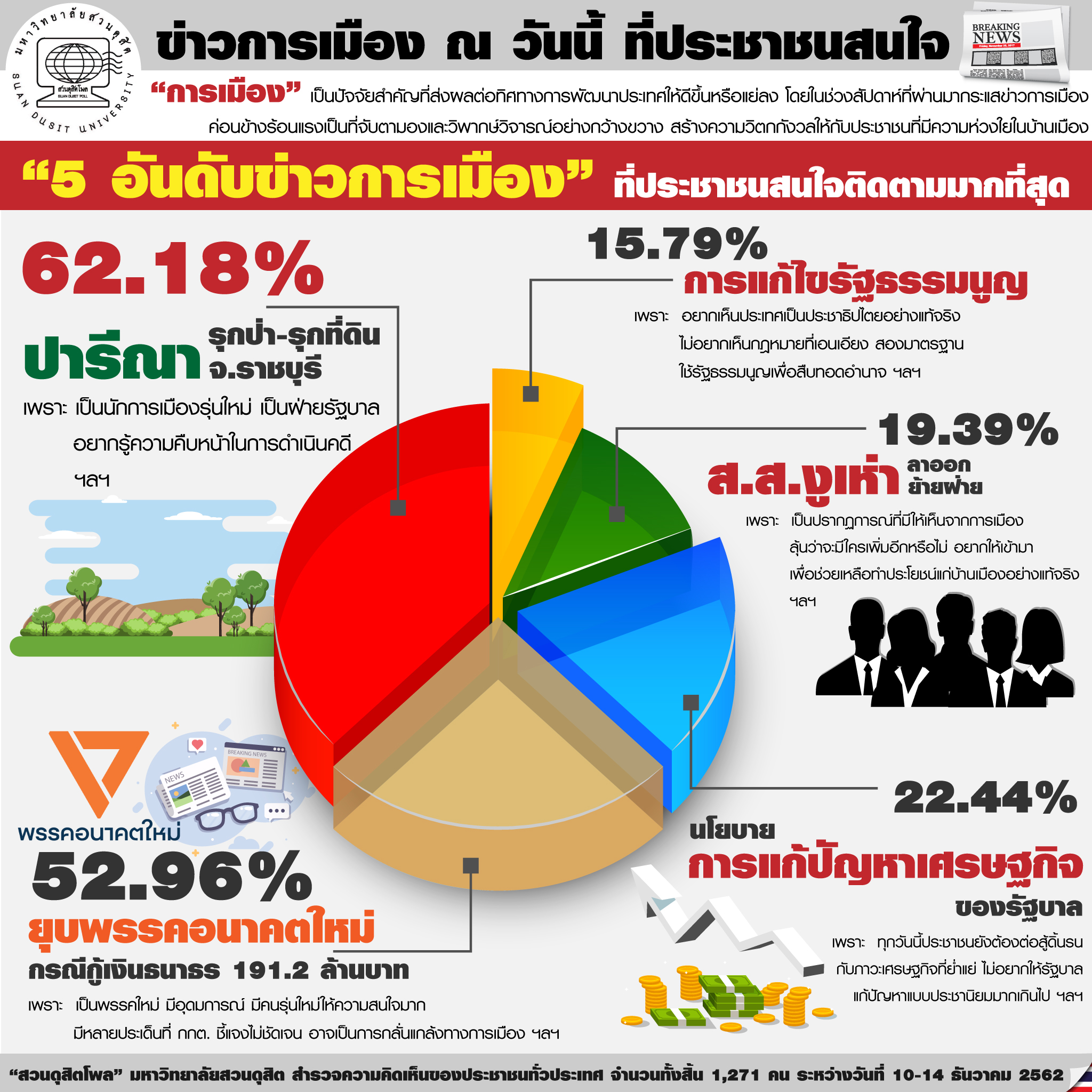 การเมืองเป็นปัจจัยสำคัญที่กำหนดทิศทางของประเทศ และมีผลกระทบโดยตรงต่อประชาชน จากการสำรวจความคิดเห็นของประชาชนจำนวน 1,271 คน ระหว่างวันที่ 10–14 ธันวาคม 2562 พบว่า 5 อันดับข่าวการเมืองที่ประชาชนสนใจมากที่สุด ได้แก่ อันดับ 1 กรณี “ปารีณา รุกป่า–รุกที่ดิน จ.ราชบุรี” (62.18%) เนื่องจากเป็นคดีที่เกี่ยวข้องกับนักการเมืองฝ่ายรัฐบาลและสะท้อนถึงปัญหากฎหมายสองมาตรฐาน อันดับ 2 กรณียุบพรรคอนาคตใหม่จากกรณีกู้เงินนายธนาธร (52.96%) ซึ่งถูกมองว่าอาจเป็นการกลั่นแกล้งทางการเมือง อันดับ 3 การแก้ปัญหาเศรษฐกิจของรัฐบาล (22.44%) ที่ประชาชนยังรู้สึกถึงภาวะเศรษฐกิจที่ย่ำแย่ อันดับ 4 กรณี “ส.ส. งูเห่า” ลาออกและย้ายขั้ว (19.39%) ซึ่งสะท้อนปัญหาคุณธรรมของนักการเมือง และอันดับ 5 การแก้ไขรัฐธรรมนูญ (15.79%) ที่ประชาชนคาดหวังให้เกิดประชาธิปไตยที่แท้จริงและไม่ใช้รัฐธรรมนูญเป็นเครื่องมือสืบทอดอำนาจ