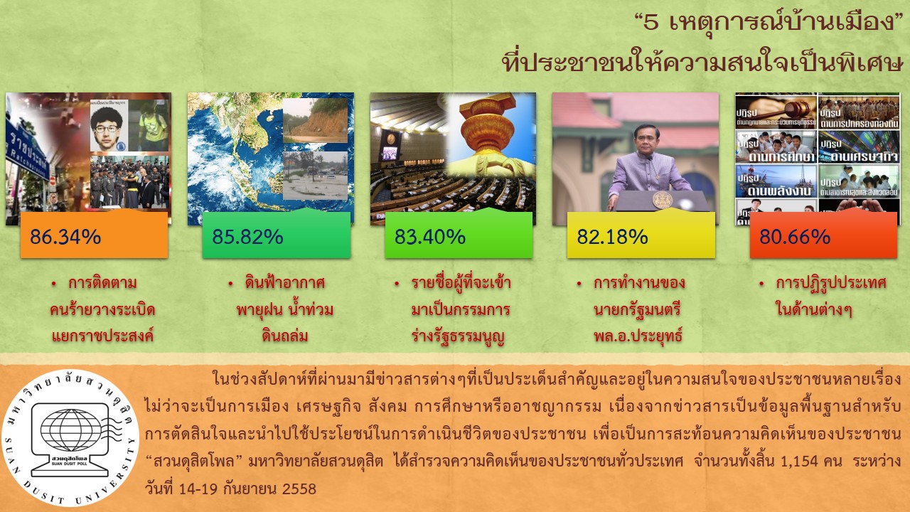 การรับรู้ข่าวสารเป็นองค์ประกอบสำคัญที่ส่งผลต่อการตัดสินใจและการดำเนินชีวิตของประชาชน “สวนดุสิตโพล” มหาวิทยาลัยสวนดุสิต จึงได้จัดทำการสำรวจความคิดเห็นของประชาชนทั่วประเทศ จำนวนทั้งสิ้น 1,154 คน ระหว่างวันที่ 14–19 กันยายน พ.ศ. 2558 เพื่อสะท้อนเหตุการณ์บ้านเมืองที่ได้รับความสนใจเป็นพิเศษ จำนวน 5 เหตุการณ์ โดยผลการสำรวจพบว่า ประชาชนให้ความสนใจสูงสุดต่อเหตุการณ์การติดตามคนร้ายวางระเบิดแยกราชประสงค์ (86.34%) รองลงมาคือสถานการณ์ภัยธรรมชาติ เช่น พายุฝน น้ำท่วม และดินถล่ม (85.82%) ตามด้วยการแต่งตั้งคณะกรรมการร่างรัฐธรรมนูญ (83.40%) การทำงานของนายกรัฐมนตรี พล.อ.ประยุทธ์ จันทร์โอชา (82.18%) และสุดท้ายคือการปฏิรูปประเทศในด้านต่าง ๆ (80.66%) เหตุผลที่ประชาชนให้ความสนใจ ได้แก่ ความกังวลต่อความมั่นคง ความเสียหายที่อาจเกิดขึ้นต่อชีวิตและทรัพย์สิน ตลอดจนความคาดหวังต่อการเปลี่ยนแปลงที่ดีขึ้นของประเทศ ข้อมูลดังกล่าวสะท้อนความต้องการและความตระหนักรู้ของประชาชนต่อประเด็นสำคัญระดับประเทศอย่างมีนัยสำคัญ