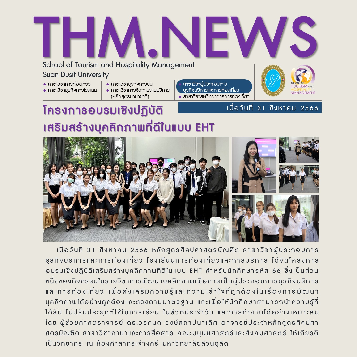 เมื่อวันที่ 31 สิงหาคม 2566 หลักสูตรศิลปศาสตรบัณฑิต สาขาวิชาผู้ประกอบการธุรกิจบริการและการท่องเที่ยว โรงเรียนการท่องเที่ยวและการบริการ ได้จัดโครงการอบรมเชิงปฎิบัติเสริมสร้างบุคลิกภาพที่ดีในแบบ EHT สำหรับนักศึกษารหัส 66 ซึ่งเป็นส่วนหนึ่งของกิจกรรมในรายวิชาการพัฒนาบุคลิกภาพเพื่อการเป็นผู้ประกอบการธุรกิจบริการและการท่องเที่ยว เพื่อส่งเสริมความรู้และความเข้าใจที่ถูกต้องในเรื่องการพัฒนาบุคลิกภาพได้อย่างถูกต้องและตรงตามมาตรฐาน และเพื่อให้นักศึกษาสามารถนำความรู้ที่ได้รับ ไปปรับประยุกต์ใช้ในการเรียน ในชีวิตประจำวัน และการทำงานได้อย่างเหมาะสม โดย ผู้ช่วยศาสตราจารย์ ดร.วรกมล วงษ์สถาปนาเลิศ อาจารย์ประจำหลักสูตรศิลปศาสตรบัณฑิต สาขาวิชาภาษาและการสื่อสาร คณะมนุษยศาสตร์และสังคมศาสตร์ ให้เกียรติเป็นวิทยากร ณ ห้องศาลากระจ่างศรี มหาวิทยาลัยสวนดุสิต