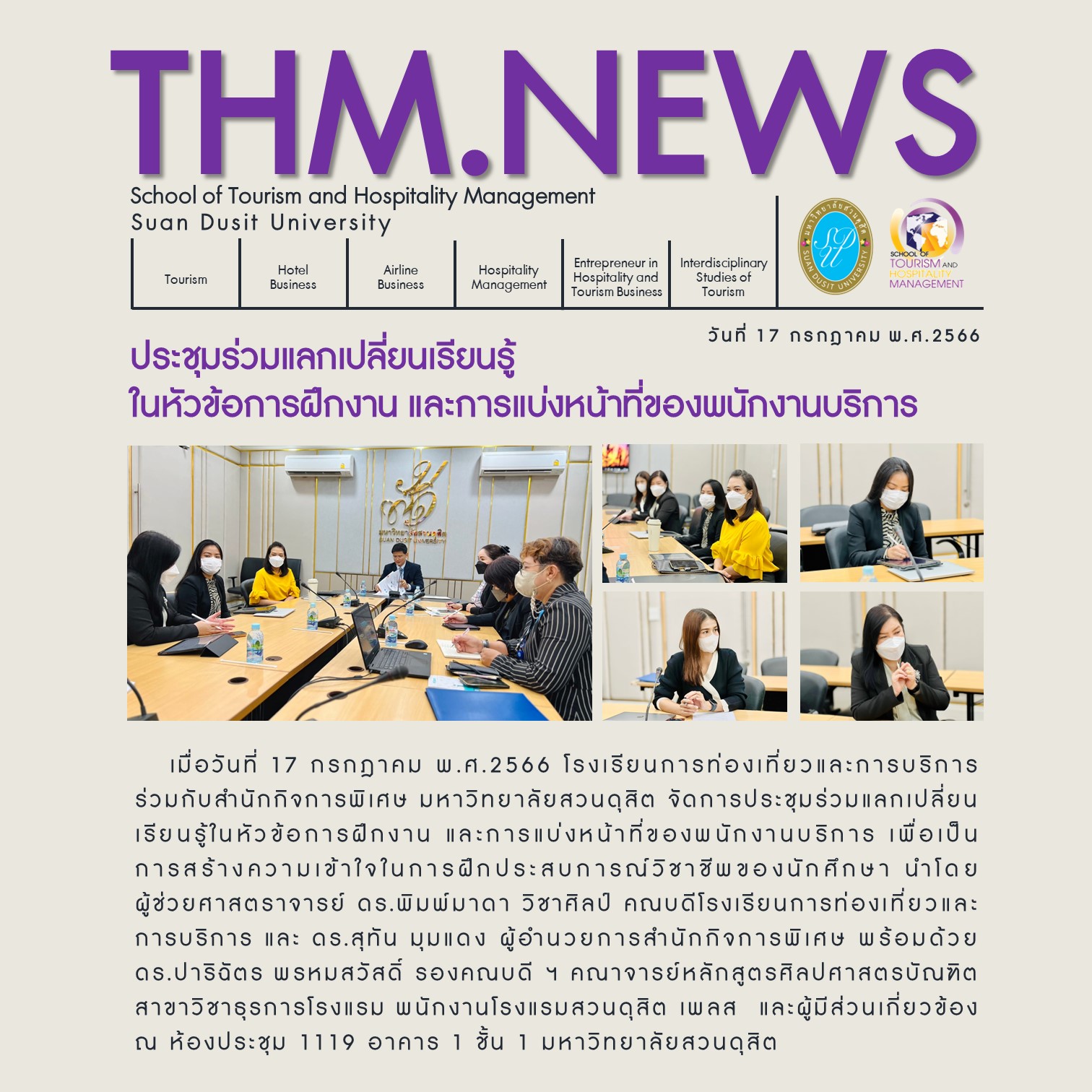 เมื่อวันที่ 17 กรกฎาคม 2566 โรงเรยีนการท่องเที่ยวและการบริการ ร่วมกับสำนักกิจการพิเศษ มหาวทิยาลัยสวนดุสิต จัดการประชุมร่วมแลกเปลี่ยนเรียนรู้ในหัวข้อการฝึกงาน และการแบ่งหน้าที่ของพนักงานบริการ เพื่อเป็นการสร้างความเข้าใจในการฝึกประสบการณ์วิชาชีพของนักศึกษา นำโดยผู้ช่วยศาสตราจารย์ ดร.พิมพ์มาดา วิชาศิลป์ คณบดีโรงเรียนการท่องเที่ยวและการบริการ และ ดร.สุทัน มุมแดง ผู้อำนวยการสำนักกิจการพิเศษ พร้อมด้วย ดร.ปาริฉัตร พรหมสวัสดิ์ รองคณบดีฯ คณาจารย์หลักสูตรศิลปศาสตรบัณฑิต สาขาธุรกิจการโรงแรม พนักงานโรงแรมสวนดุสิต เพลส และผู้ที่มีสวนเกี่ยวข้อง ณ ห้องประชุม 1119 อาคาร 1 ชชั้น 1 มหาวทิยาลัยสวนดุสิต