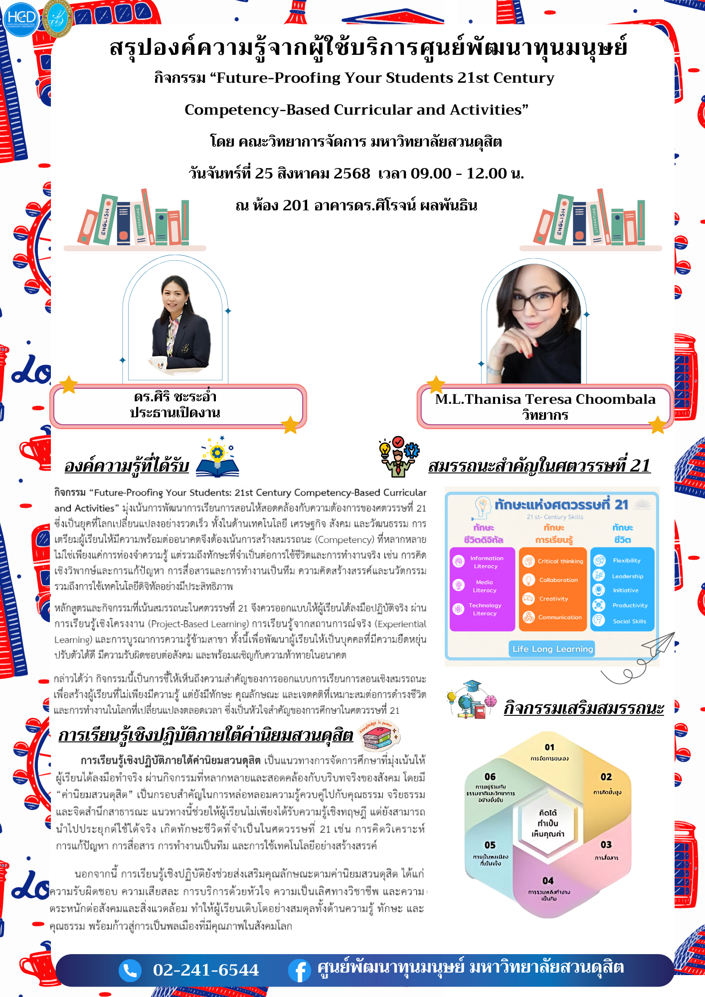 กิจกรรม “Future-Proofing Your Students: 21st Century Competency-Based Curricular and Activities” จัดขึ้นเพื่อพัฒนาความเข้าใจและทักษะด้านการออกแบบหลักสูตรและกิจกรรมที่เน้นสมรรถนะเป็นฐาน โดยตอบสนองต่อความต้องการของผู้เรียนในศตวรรษที่ 21 กิจกรรมนี้เน้นการแลกเปลี่ยนประสบการณ์และแนวทางการจัดการเรียนรู้ที่ช่วยเสริมสร้างทักษะการคิดวิเคราะห์ การสื่อสาร การทำงานร่วมกัน และการสร้างสรรค์นวัตกรรม เพื่อเตรียมความพร้อมให้ผู้เรียนก้าวทันการเปลี่ยนแปลงของสังคมและโลกอนาคตอย่างมั่นใจ