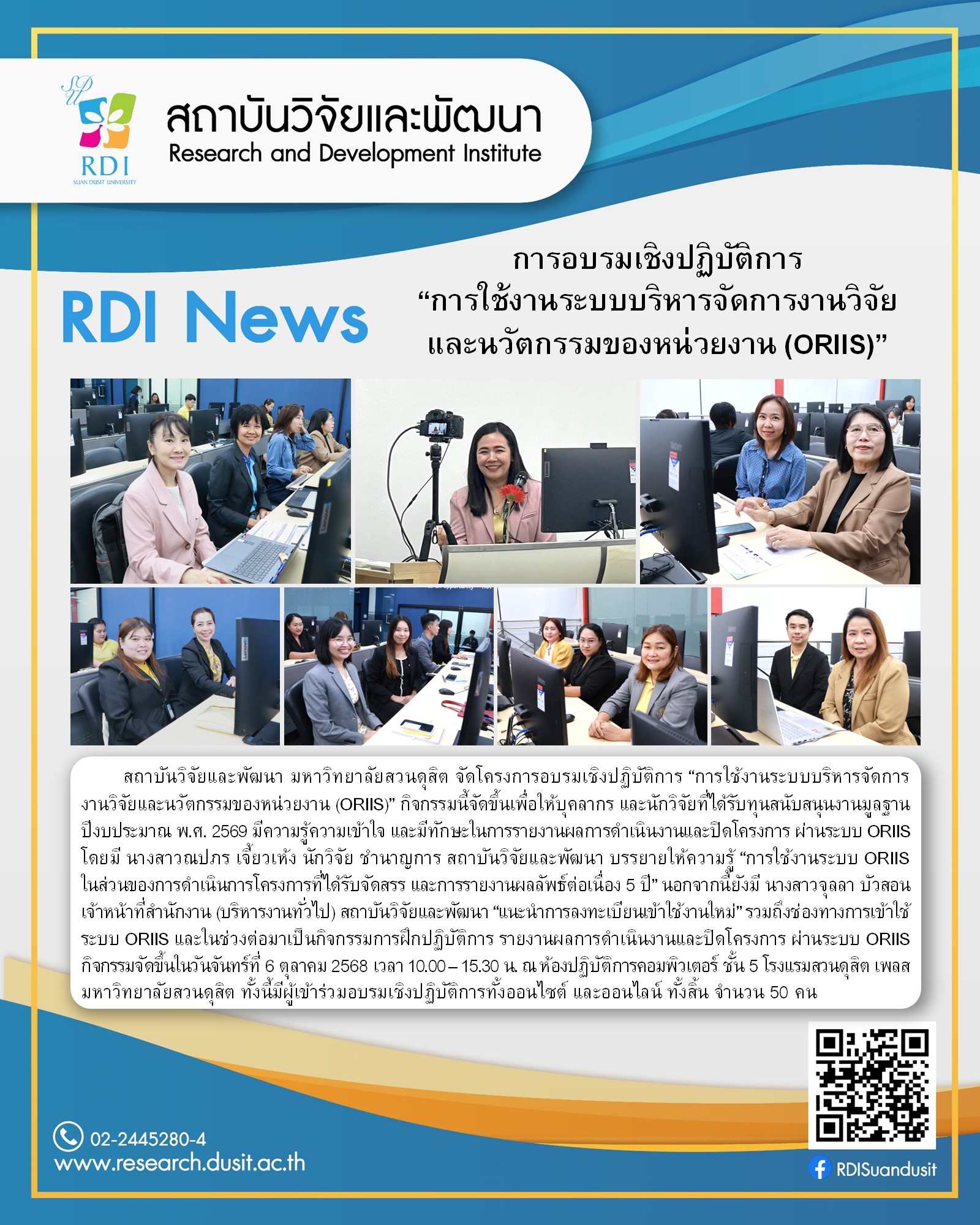 สถาบันวิจัยและพัฒนา มหาวิทยาลัยสวนดุสิต จัดโครงการอบรมเชิงปฏิบัติการ “การใช้งานระบบบริหารจัดการงานวิจัยและนวัตกรรมของหน่วยงาน (ORIIS)” กิจกรรมนี้จัดขึ้นเพื่อให้บุคลากร และนักวิจัยที่ได้รับทุนสนับสนุนงานมูลฐานปีงบประมาณ พ.ศ. 2569 มีความรู้ความเข้าใจ และมีทักษะในการรายงานผลการดำเนินงานและปิดโครงการ ผ่านระบบ ORIIS โดยมี นางสาวณปภร เจี้ยวเห้ง นักวิจัย ชำนาญการ สถาบันวิจัยและพัฒนา บรรยายให้ความรู้ “การใช้งานระบบ ORIIS ในส่วนของการดำเนินการโครงการที่ได้รับจัดสรร และการรายงานผลลัพธ์ต่อเนื่อง 5 ปี” นอกจากนี้ยังมี นางสาวจุลลา บัวสอน เจ้าหน้าที่สำนักงาน (บริหารงานทั่วไป) สถาบันวิจัยและพัฒนา “แนะนำการลงทะเบียนเข้าใช้งานใหม่” รวมถึงช่องทางการเข้าใช้ระบบ ORIIS และในช่วงต่อมาเป็นกิจกรรมการฝึกปฏิบัติการ รายงานผลการดำเนินงานและปิดโครงการ ผ่านระบบ ORIISกิจกรรมจัดขึ้นในวันจันทร์ที่ 6 ตุลาคม 2568 เวลา 10.00 – 15.30 น. ณ ห้องปฏิบัติการคอมพิวเตอร์ ชั้น 5 โรงแรมสวนดุสิต เพลส มหาวิทยาลัยสวนดุสิต ทั้งนี้มีผู้เข้าร่วมอบรมเชิงปฏิบัติการทั้งออนไซต์ และออนไลน์ ทั้งสิ้น จำนวน 50 คน