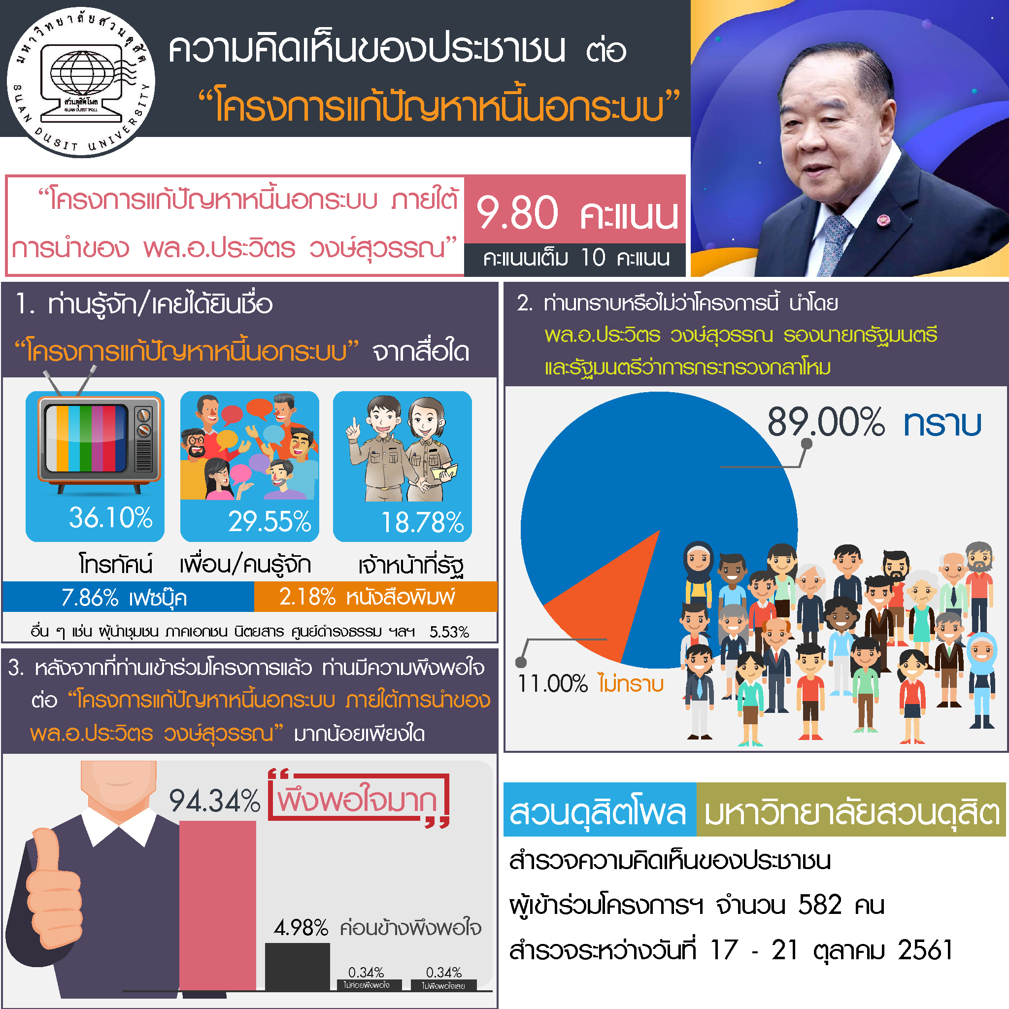 เพื่อรับมือกับปัญหาหนี้นอกระบบที่ส่งผลกระทบต่อชีวิตความเป็นอยู่ของประชาชนจำนวนมาก โดยเฉพาะในภาคตะวันออกเฉียงเหนือ รัฐบาลได้ดำเนิน “โครงการแก้ปัญหาหนี้นอกระบบ” ภายใต้การนำของ พล.อ.ประวิตร วงษ์สุวรรณ ซึ่งเน้นการประสานเจรจาระหว่างเจ้าหนี้และลูกหนี้ เพื่อไกล่เกลี่ยและคืนทรัพย์สินให้กับประชาชน “สวนดุสิตโพล” ได้สำรวจความคิดเห็นของประชาชนจำนวน 582 คน ระหว่างวันที่ 17–21 ตุลาคม 2561 ผลการสำรวจพบว่า ประชาชนส่วนใหญ่รู้จักโครงการนี้จากโทรทัศน์ (36.10%) และเพื่อนหรือคนรู้จัก (29.55%) โดย 89% ทราบว่าผู้นำโครงการคือ พล.อ.ประวิตร ขณะที่ความพึงพอใจต่อโครงการอยู่ในระดับสูงมาก โดย 94.34% พึงพอใจอย่างมาก และให้คะแนนเฉลี่ย 9.80 เต็ม 10 โดยให้เหตุผลว่าโครงการช่วยให้พวกเขาได้โฉนดคืน ลดภาระหนี้ และบรรเทาความเดือดร้อนในชีวิตประจำวันได้อย่างเป็นรูปธรรม