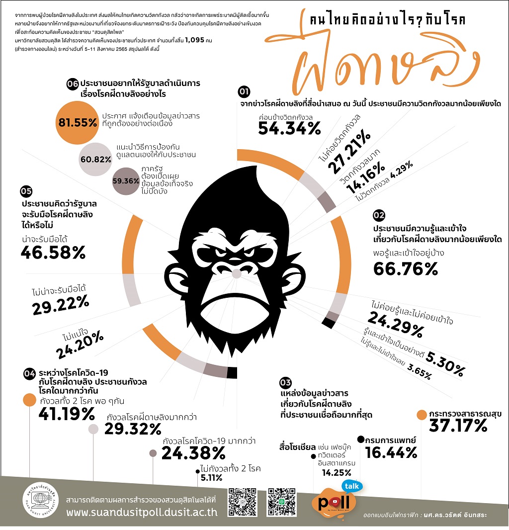 จากกรณีการพบผู้ป่วยโรคฝีดาษลิงในประเทศไทย ทำให้ประชาชนเกิดความวิตกกังวล โดยร้อยละ 54.34 ระบุว่าค่อนข้างกังวลต่อสถานการณ์นี้ แม้ประชาชนส่วนใหญ่มีความรู้และเข้าใจเกี่ยวกับโรคในระดับหนึ่ง แต่ยังต้องการข้อมูลที่ถูกต้องและสม่ำเสมอ โดยเฉพาะจากแหล่งข่าวที่เชื่อถือได้ เช่น กระทรวงสาธารณสุขและกรมการแพทย์ ประชาชนร้อยละ 81.55 ต้องการให้ภาครัฐแจ้งเตือนข้อมูลข่าวสารอย่างต่อเนื่อง และแนะนำวิธีการดูแลตนเองอย่างถูกต้อง ความกังวลยังรวมถึงภาพลักษณ์ของผู้ป่วยที่มีอาการทางผิวหนัง การตีตราทางสังคม โดยเฉพาะในกลุ่มชายรักชาย ตลอดจนผลกระทบทางเศรษฐกิจจากการหยุดงานและค่ารักษาพยาบาล ทั้งนี้ แม้ประชาชนจะวิตก แต่ยังมีความมั่นใจว่ารัฐบาลสามารถรับมือได้ อย่างไรก็ตาม การสื่อสารที่ชัดเจนและโปร่งใสจากรัฐยังคงเป็นสิ่งจำเป็นในการสร้างความเชื่อมั่นและลดความตื่นตระหนกของประชาชน พร้อมกับส่งเสริมให้ประชาชนป้องกันตนเองและติดตามข่าวสารจากแหล่งที่เชื่อถือได้