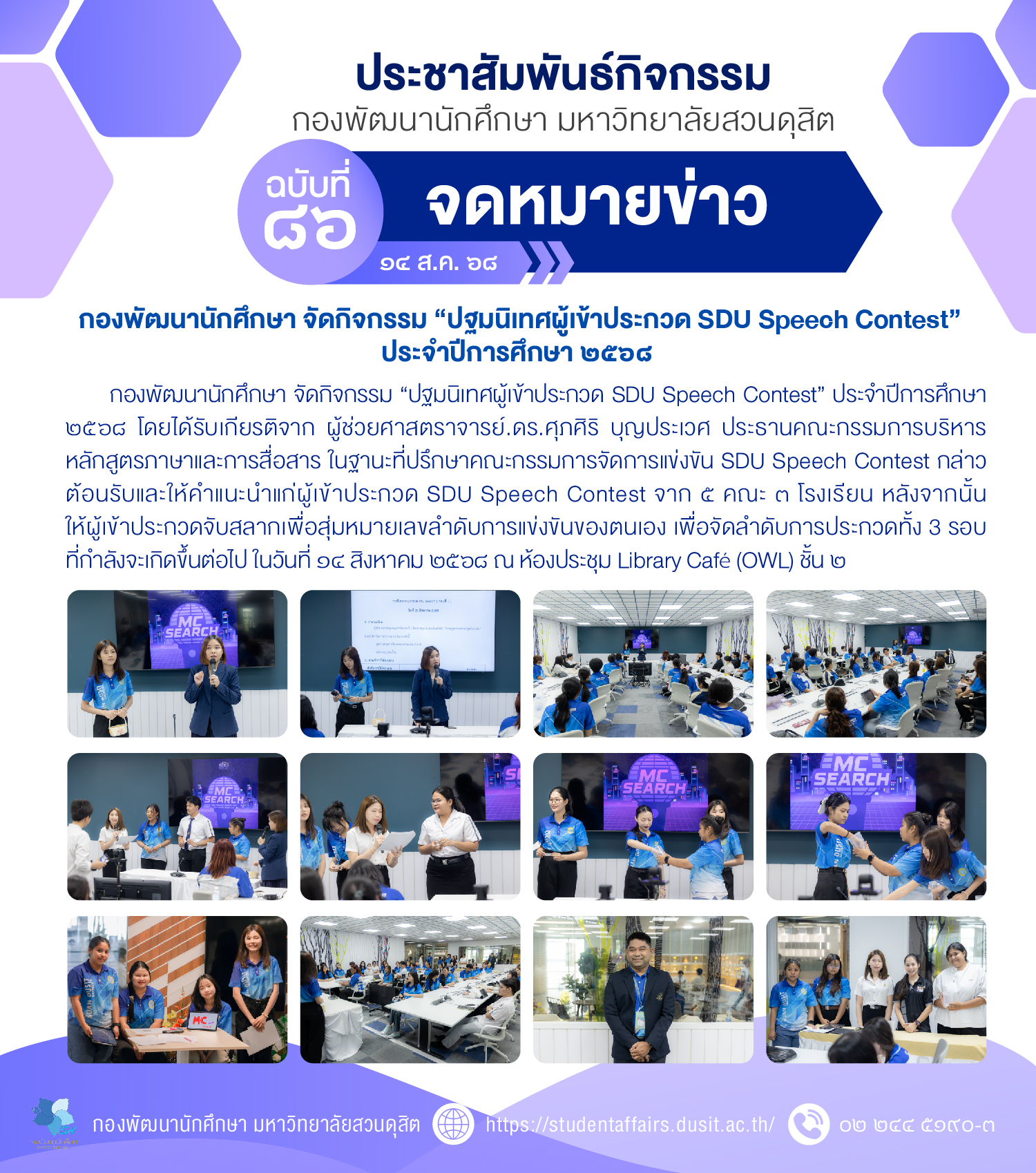 กองพัฒนานักศึกษา จัดกิจกรรม “ปฐมนิเทศผู้เข้าประกวด SDU Speech Contest” ประจำปีการศึกษา ๒๕๖๘ โดยได้รับเกียรติจาก ผู้ช่วยศาสตราจารย์ ดร.ศุภศิริ บุญประเวศ ประธานคณะกรรมการบริหาร หลักสูตรภาษาและการสื่อสาร ในฐานะที่ปรึกษาคณะกรรมการจัดการแข่งขัน SDU Speech Contest กล่าวต้อนรับและให้คำแนะนำแก่ผู้เข้าประกวด SDU Speech Contest จาก ๕ คณะ ๓ โรงเรียน หลังจากนั้น ให้ผู้เข้าประกวดจับสลากเพื่อสุ่มหมายเลขลำดับการแข่งขันของตนเอง เพื่อจัดลำดับการประกวดทั้ง ๓ รอบ ที่กำลังจะเกิดขึ้นต่อไป ในวันที่ ๑๔ สิงหาคม ๒๕๖๘ ณ ห้องประชุม Library Café (OWL) ชั้น ๒