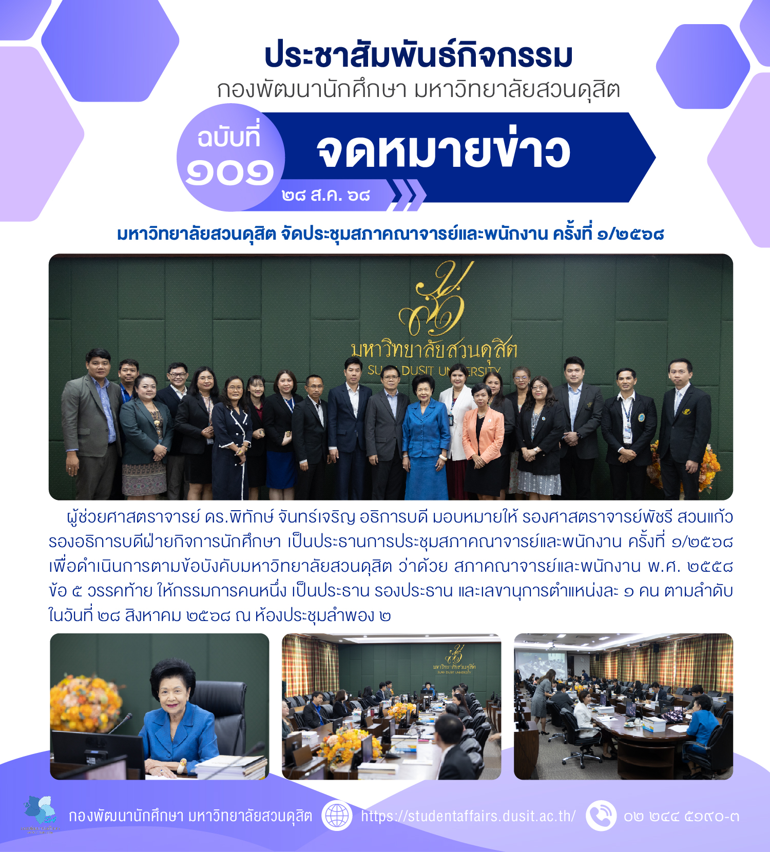 ผู้ช่วยศาสตราจารย์ ดร.พิทักษ์ จันทร์เจริญ อธิการบดี มอบหมายให้ รองศาสตราจารย์พัชรี สวนแก้ว รองอธิการบดีฝ่ายกิจการนักศึกษา เป็นประธานการประชุมสภาคณาจารย์และพนักงาน ครั้งที่ ๑/๒๕๖๘ เพื่อดำเนินการตามข้อบังคับมหาวิทยาลัยสวนดุสิต ว่าด้วย สภาคณาจารย์และพนักงาน พ.ศ. ๒๕๕๘ ข้อ ๕ วรรคท้าย ให้กรรมการคนหนึ่ง เป็นประธาน รองประธาน และเลขานุการตำแหน่งละ ๑ คน ตามลำดับ ในวันที่ ๒๘ สิงหาคม ๒๕๖๘ ณ ห้องประชุมลำพอง ๒