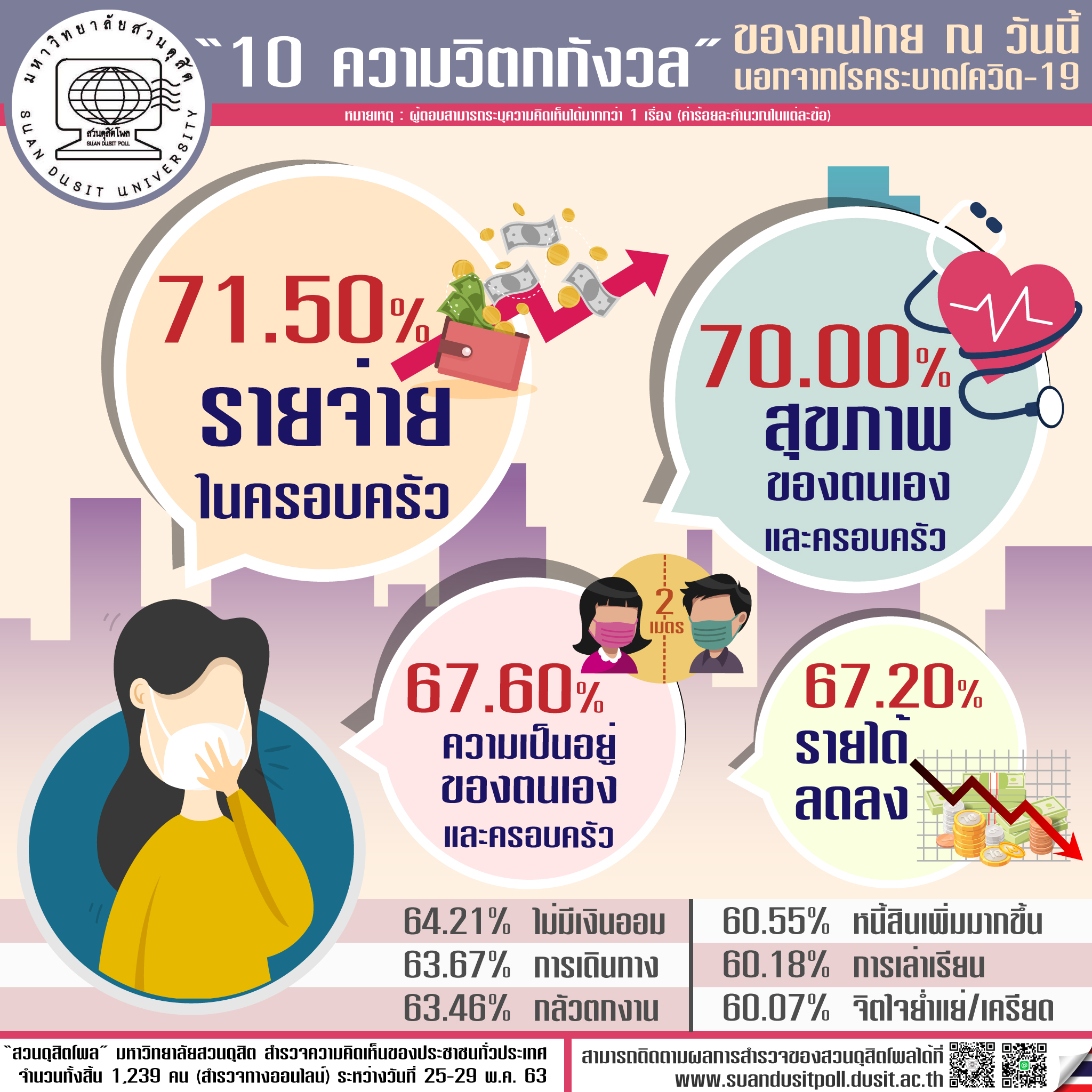 สวนดุสิตโพล มหาวิทยาลัยสวนดุสิต ได้ทำการสำรวจความคิดเห็นของประชาชนจำนวน 1,239 คน ระหว่างวันที่ 25–29 พฤษภาคม 2563 เพื่อตรวจสอบระดับความวิตกกังวลของคนไทยในบริบทของวิกฤตโควิด-19 และปัจจัยอื่น ๆ ที่เกี่ยวข้อง ผลสำรวจพบว่า ความกังวลสูงสุดของประชาชนคือค่าใช้จ่ายในครอบครัว (ร้อยละ 71.50) รองลงมาคือสุขภาพของตนเองและครอบครัว ชีวิตความเป็นอยู่ รายได้ที่ลดลง และการขาดเงินออม ความกังวลยังรวมถึงปัญหาการเดินทาง การทำงาน ความไม่มั่นคงในอาชีพ หนี้สิน ปัญหาด้านการศึกษา และสุขภาพจิต สะท้อนให้เห็นถึงความท้าทายในชีวิตประจำวันที่ครอบคลุมทั้งมิติทางเศรษฐกิจ สังคม และจิตใจ ซึ่งต้องการการแก้ไขอย่างเร่งด่วนและบูรณาการจากภาครัฐและภาคส่วนต่าง ๆ