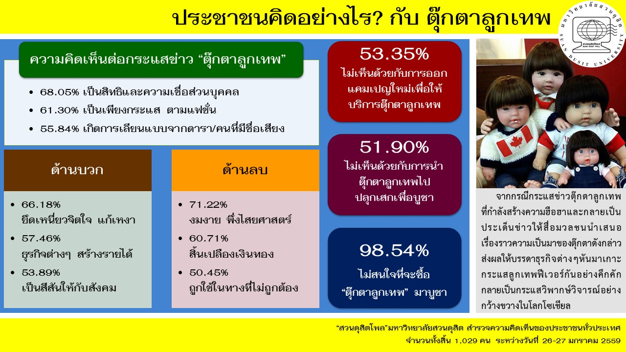 จากกระแสข่าว “ตุ๊กตาลูกเทพ” ซึ่งเป็นปรากฏการณ์ที่ได้รับความสนใจจากสังคมไทยในช่วงเวลาหนึ่ง ทั้งในแง่ความเชื่อส่วนบุคคลและการตลาด “สวนดุสิตโพล” มหาวิทยาลัยสวนดุสิต ได้สำรวจความคิดเห็นของประชาชนทั่วประเทศจำนวน 1,029 คน ระหว่างวันที่ 26–27 มกราคม 2559 เพื่อสะท้อนมุมมองที่หลากหลายของสังคมต่อปรากฏการณ์ดังกล่าว ผลสำรวจพบว่า ประชาชนส่วนใหญ่มองว่าเรื่องนี้เป็นสิทธิส่วนบุคคล ไม่ควรให้ความสำคัญมากเกินไป ขณะเดียวกันก็มีการวิพากษ์วิจารณ์ว่าเป็นเรื่องตามกระแส ล้าหลัง และสิ้นเปลือง ด้านบวกของตุ๊กตาลูกเทพคือ การเป็นที่พึ่งทางใจและสร้างรายได้ทางธุรกิจ ในขณะที่ด้านลบคือ การถูกมองว่างมงาย และมีการนำไปใช้ในทางไม่เหมาะสม นอกจากนี้ ประชาชนส่วนใหญ่ไม่เห็นด้วยกับการปลุกเสกหรือบูชาตุ๊กตาดังกล่าว โดยมองว่าเป็นเรื่องขัดต่อหลักศาสนา และส่วนมากไม่มีความสนใจที่จะซื้อมาบูชา เนื่องจากมองว่าไม่ใช่หนทางในการเปลี่ยนแปลงชีวิตอย่างแท้จริง