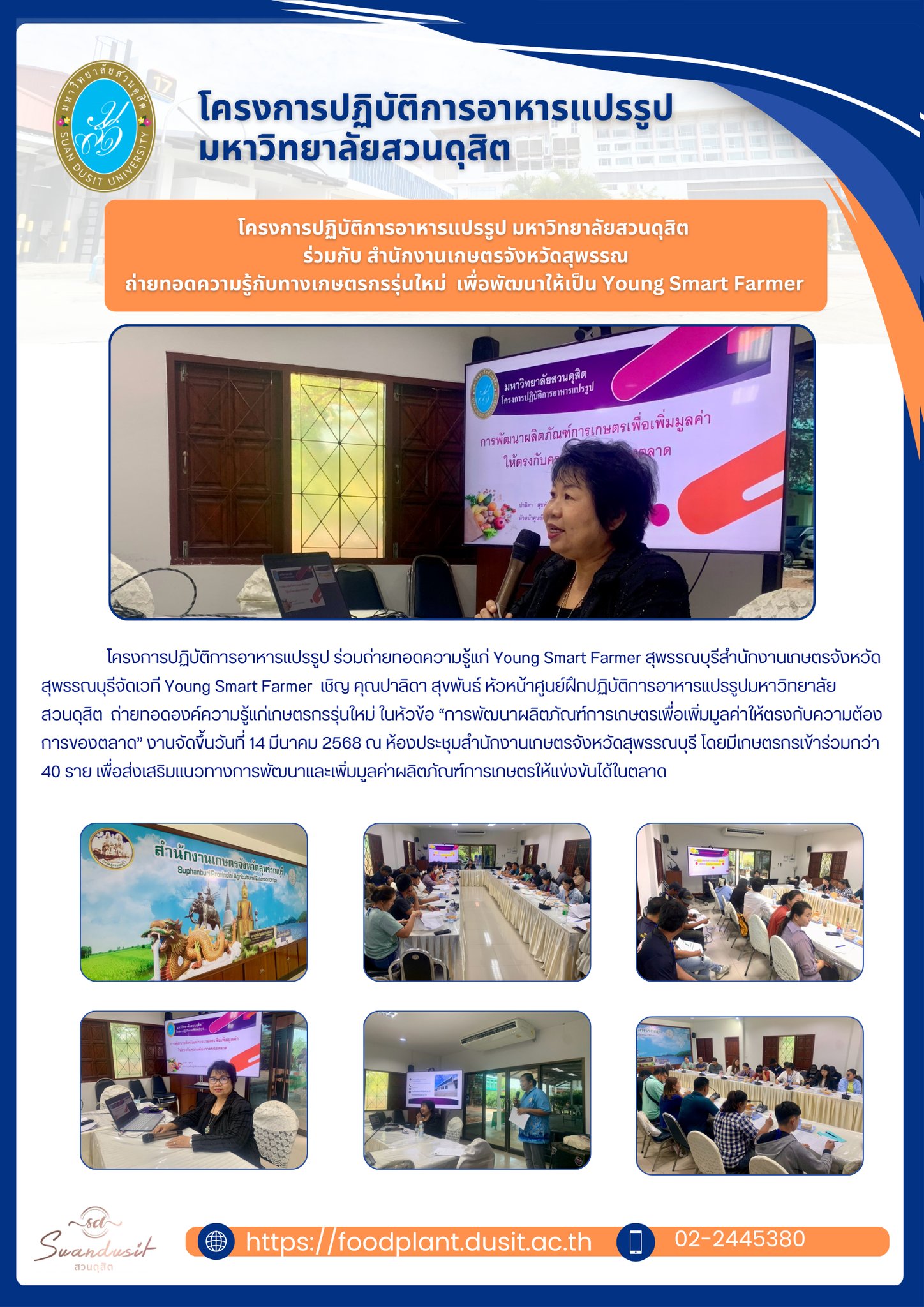ยกระดับผลิตภัณฑ์เกษตร ตอบโจทย์ตลาดยุคใหม่! โครงการปฏิบัติการอาหารแปรรูป ม.สวนดุสิต ร่วมแชร์ความรู้กับ Young Smart Farmer สำนักงานเกษตรจังหวัดสุพรรณบุรี แนะเคล็ดลับ "การพัฒนาผลิตภัณฑ์การเกษตรเพื่อเพิ่มมูลค่าให้ตรงกับความต้องการของตลาด" เกษตรกรรุ่นใหม่กว่า 40 ราย ร่วมเรียนรู้แนวทางการเพิ่มมูลค่าให้แข่งขันได้จริง!