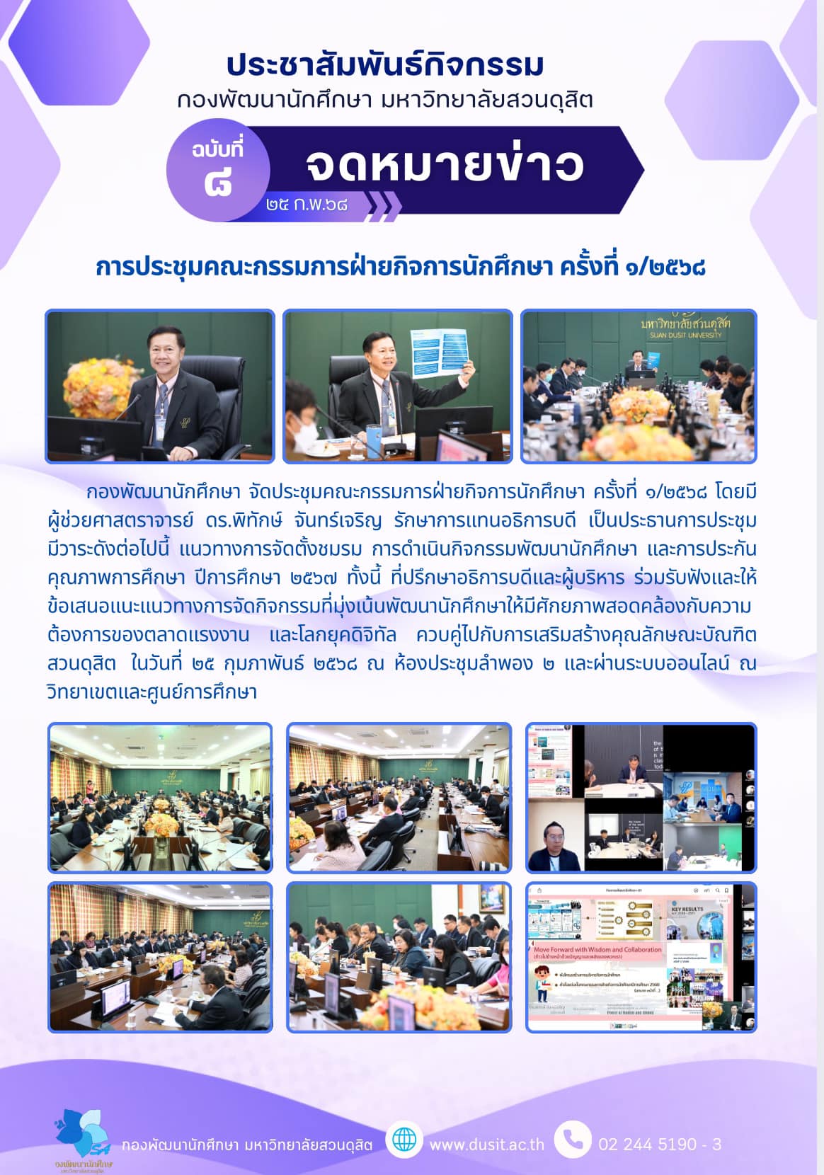 กองพัฒนานักศึกษา จัดประชุมคณะกรรมการฝ่ายกิจการนักศึกษา ครั้งที่ 1/2568 โดยมี ผู้ช่วยศาสตราจารย์ ดร.พิทักษ์ จันทร์เจริญ รักษาการแทนอธิการบดี เป็นประธาน การประชุมมีระเบียบวาระดังนี้ แนวทางการจัดตั้งชมรม, การดำเนินกิจกรรมพัฒนานักศึกษา และการประกันคุณภาพการศึกษา ปีการศึกษา ๒๕๖๗, ทั้งนี้ที่ปรึกษาอธิการบดีและผู้บริหาร ร่วมรับฟังและให้ข้อเสนอแนะแนวทางการจัดกิจกรรม ที่มุ่งเน้นพัฒนานักศึกษาให้มีศักยภาพสอดคล้องกับความต้องการของตลาดแรงงานและโลกยุคดิจิทัล ควบคู่ไปกับการเสริมสร้างคุณลักษณะบัณฑิตสวนดุสิต วันที่ 25 กุมภาพันธ์ 2568 ณ ห้องประชุมลำพอง 2 และผ่านระบบออนไลน์ ณ วิทยาเขตและศูนย์การศึกษา