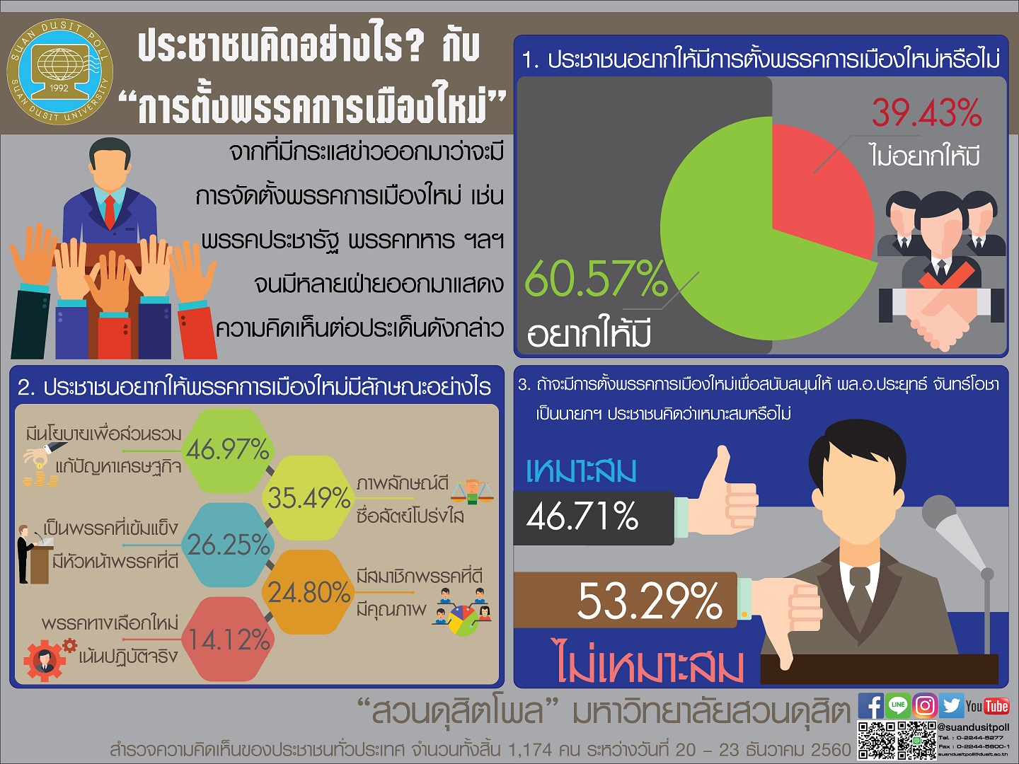 การสำรวจความคิดเห็นของประชาชนต่อกระแสข่าวการจัดตั้งพรรคการเมืองใหม่ เช่น พรรคประชารัฐ พรรคทหาร โดยมหาวิทยาลัยสวนดุสิต ระหว่างวันที่ 20-23 ธันวาคม 2560 จำนวน 1,174 คน พบว่า ประชาชนส่วนใหญ่อยากให้มีการตั้งพรรคการเมืองใหม่ (60.57%) เนื่องจากเป็นทางเลือกใหม่ให้ประชาชนมีตัวเลือกมากขึ้น เปิดโอกาสให้คนใหม่เข้ามาทำงาน ส่วนที่ไม่เห็นด้วย (39.43%) มองว่าจะเป็นนักการเมืองหน้าเดิมไม่มีอะไรแปลกใหม่ สำหรับลักษณะที่ประชาชนต้องการจากพรรคการเมืองใหม่ ได้แก่ มีนโยบายทำเพื่อส่วนรวมแก้ปัญหาเศรษฐกิจ (46.97%) ภาพลักษณ์ดีซื่อสัตย์โปร่งใส (35.49%) และเป็นพรรคที่เข้มแข็งมีจุดยืน (26.25%) อย่างไรก็ตาม เมื่อถามเรื่องการตั้งพรรคเพื่อสนับสนุนให้ พล.อ.ประยุทธ์ เป็นนายกฯ ประชาชนส่วนใหญ่เห็นว่าไม่เหมาะสม (53.29%) เพราะอาจถูกมองว่าเป็นการสืบทอดอำนาจ