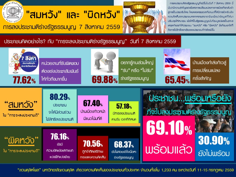 การลงประชามติร่างรัฐธรรมนูญในวันที่ 7 สิงหาคม 2559 ถือเป็นจุดเปลี่ยนสำคัญของการเมืองไทย มุ่งสู่การปกครองในระบอบประชาธิปไตย “สวนดุสิตโพล” ได้สำรวจความคิดเห็นของประชาชนทั่วประเทศ จำนวน 1,233 คน ระหว่างวันที่ 11–15 กรกฎาคม 2559 ผลสำรวจพบว่าประชาชนคาดหวังให้หน่วยงานที่เกี่ยวข้องเร่งประชาสัมพันธ์ให้เข้าถึงประชาชนอย่างทั่วถึง พร้อมเน้นการใช้วิจารณญาณในการรับฟังข่าวสาร สิ่งที่ประชาชนรู้สึก “สมหวัง” คือการได้มีส่วนร่วมทางประชาธิปไตย และเห็นแนวโน้มที่ประเทศจะเข้าสู่การเลือกตั้ง ขณะที่สิ่งที่ “ผิดหวัง” คือความขัดแย้งทางความคิด เสรีภาพในการแสดงความคิดเห็นที่ถูกจำกัด และความไม่เข้าใจเนื้อหาร่างรัฐธรรมนูญในบางกลุ่ม เมื่อสอบถามถึงความพร้อมในการไปลงประชามติ พบว่า 69.10% ระบุว่าพร้อมแล้ว แสดงถึงเจตจำนงของประชาชนในการมีส่วนร่วมกำหนดอนาคตประเทศ แม้จะยังมีความท้าทายด้านการสื่อสารและความเข้าใจที่ต้องได้รับการแก้ไข