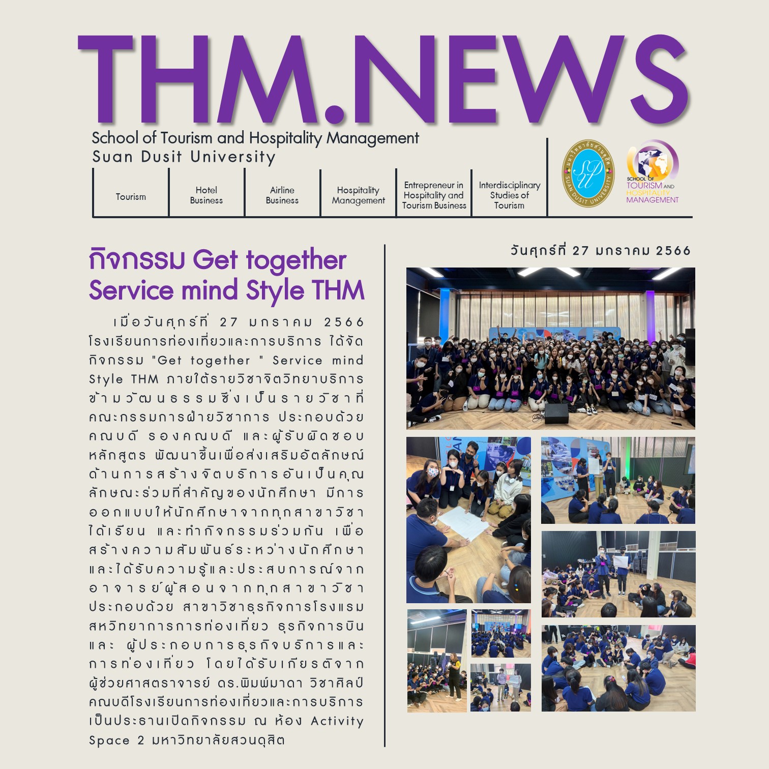 เมื่อวันศุกร์ที่ 27 มกราคม 2566 โรงเรียนการท่องเที่ยวและการบริการ ได้จัดกิจกรรม "Get together " Service mind Style THM ภายใต้รายวิชาจิตวิทยาบริการข้ามวัฒนธรรมซึ่งเป็นรายวิชาที่คณะกรรมการฝ่ายวิชาการ ประกอบด้วยคณบดี รองคณบดี และผู้รับผิดชอบหลักสูตร พัฒนาขึ้นเพื่อส่งเสริมอัตลักษณ์ด้านการสร้างจิตบริการอันเป็นคุณลักษณะร่วมที่สำคัญของนักศึกษา มีการออกแบบให้นักศึกษาจากทุกสาขาวิชาได้เรียน และทำกิจกรรมร่วมกัน เพื่อสร้างความสัมพันธ์ระหว่างนักศึกษาและได้รับความรู้และประสบการณ์จากอาจารย์ผู้สอนจากทุกสาขาวิชา ประกอบด้วย สาขาวิชาธุรกิจการโรงแรม สหวิทยาการการท่องเที่ยว ธุรกิจการบิน และ ผู้ประกอบการธุรกิจบริการและการท่องเที่ยว โดยได้รับเกียรติจาก ผู้ช่วยศาสตราจารย์ ดร.พิมพ์มาดา วิชาศิลป์ คณบดีโรงเรียนการท่องเที่ยวและการบริการ เป็นประธานเปิดกิจกรรม ณ ห้อง Activity Space 2 มหาวิทยาลัยสวนดุสิต