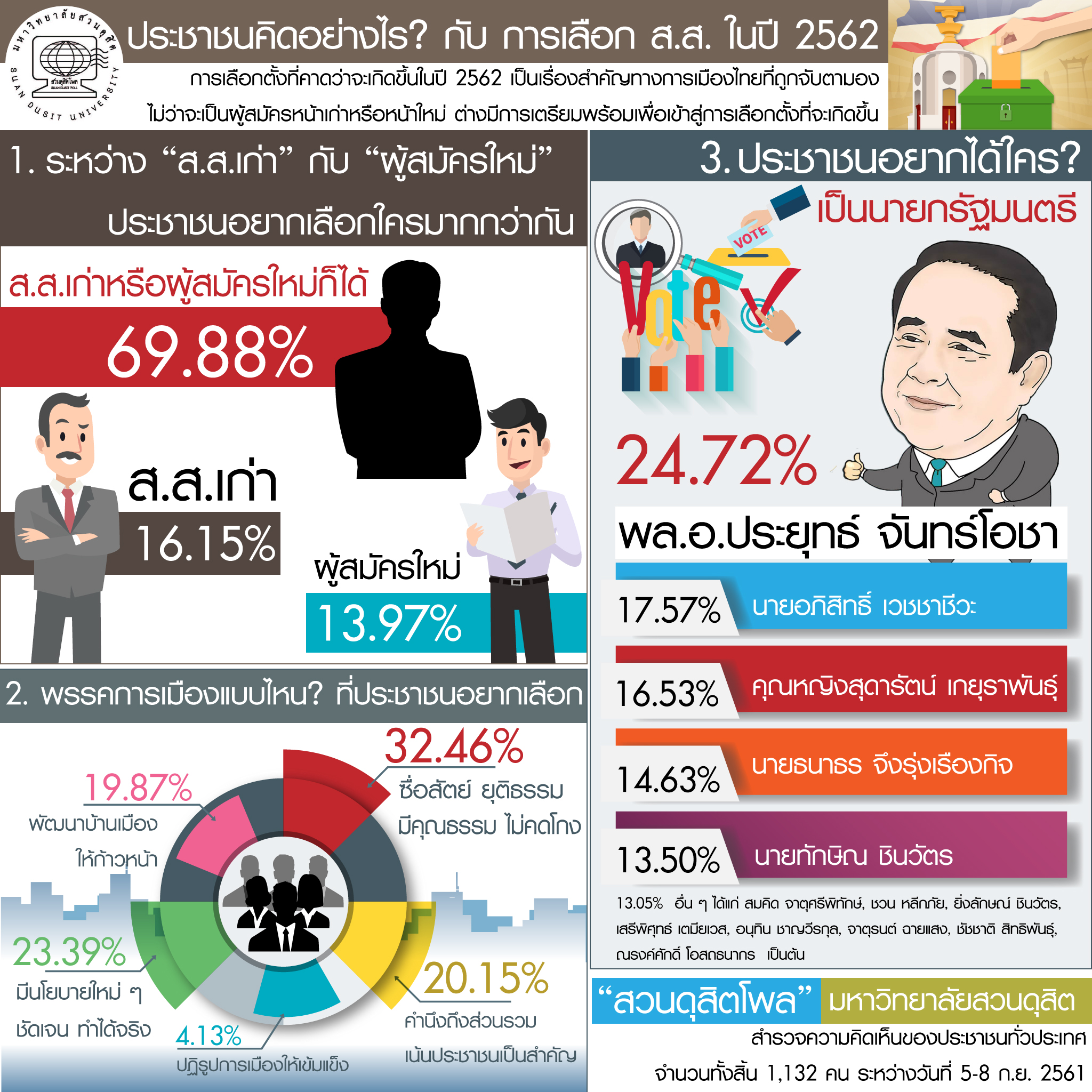 ก่อนการเลือกตั้งปี 2562 ซึ่งเป็นการเลือกตั้งทั่วไปครั้งแรกในรอบเกือบห้าปี “สวนดุสิตโพล” ได้สำรวจความคิดเห็นของประชาชนจำนวน 1,132 คน ระหว่างวันที่ 5–8 กันยายน 2561 เพื่อสะท้อนทัศนคติของผู้มีสิทธิเลือกตั้งเกี่ยวกับตัวผู้สมัคร พรรคการเมือง และผู้ที่ประชาชนอยากให้เป็นนายกรัฐมนตรี ผลสำรวจระบุว่า ประชาชนส่วนใหญ่ (69.88%) ไม่ยึดติดว่าผู้สมัครจะเป็น ส.ส. เก่าหรือใหม่ ขอเพียงมีคุณภาพและความซื่อสัตย์ ขณะที่คุณสมบัติพรรคการเมืองที่ประชาชนอยากเลือกมากที่สุดคือความซื่อสัตย์ ยุติธรรม มีคุณธรรม และนโยบายที่ทำได้จริง ในส่วนของผู้ที่ประชาชนอยากให้เป็นนายกรัฐมนตรี อันดับหนึ่งคือ พล.อ.ประยุทธ์ จันทร์โอชา (24.72%) รองลงมาคือ นายอภิสิทธิ์ เวชชาชีวะ (17.57%) และคุณหญิงสุดารัตน์ เกยุราพันธุ์ (16.53%) โดยมีตัวเลือกอื่น ๆ ที่ได้รับการกล่าวถึงอีกจำนวนหนึ่ง สะท้อนถึงความหลากหลายในการรับรู้และความคาดหวังของประชาชนต่อผู้นำประเทศในอนาคต
