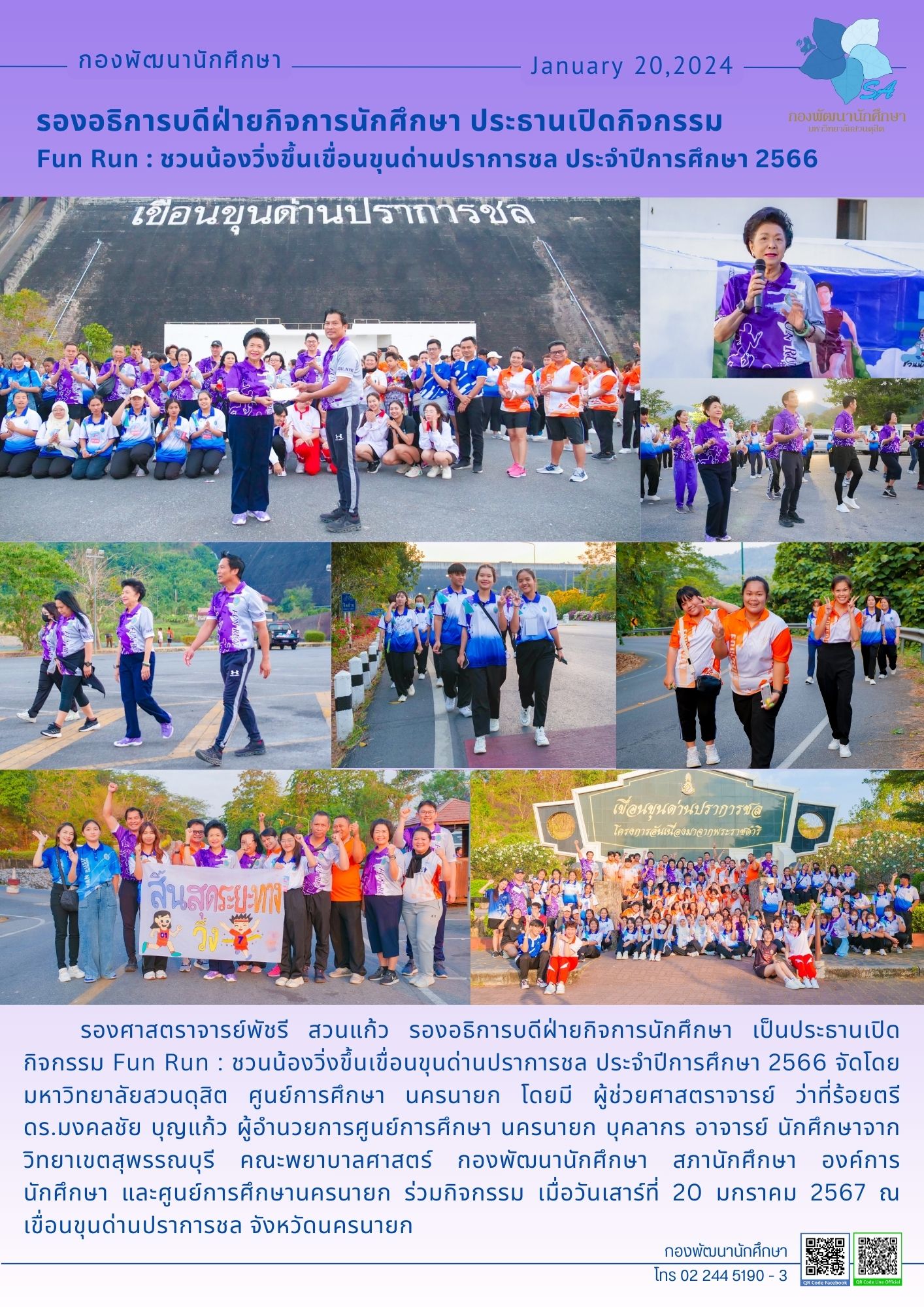 รองศาสตราจารย์ พัชรี สวนแก้ว รองอธิการบดีฝ่ายกิจการนักศึกษา เป็นประธานเปิดกิจกรรม Fun Run : ชวนน้องวิ่งขึ้นเขื่อนขุนด่านปราการชล ประจำปีการศึกษา 2566 จัดโดยมหาวิทยาลัยสวนดุสิต ศูนย์การศึกษานครนายก โดยมีผู้ช่วยศาสตราจารย์ ว่าที่ร้อยตรี ดร.มงคลชัย บุญแก้ว ผู้อำนวยการศูนย์การศึกษานครนายก มีบุคลากร อาจารย์ นักศึกษาจากวิทยาเขตสุพรรณบุรี คณะพยาบาลศาสตร์ กองพัฒนานักศึกษา สภานักศึกษา องค์การนักศึกษา และศูนย์การศึกษานครนายก เข้าร่วมในกิจกรรมดังกล่าว ในวันเสาร์ที่ 20 มกราคม 2567 ณ เขื่อนขุนด่านปราการชล จังหวัดนครนายก