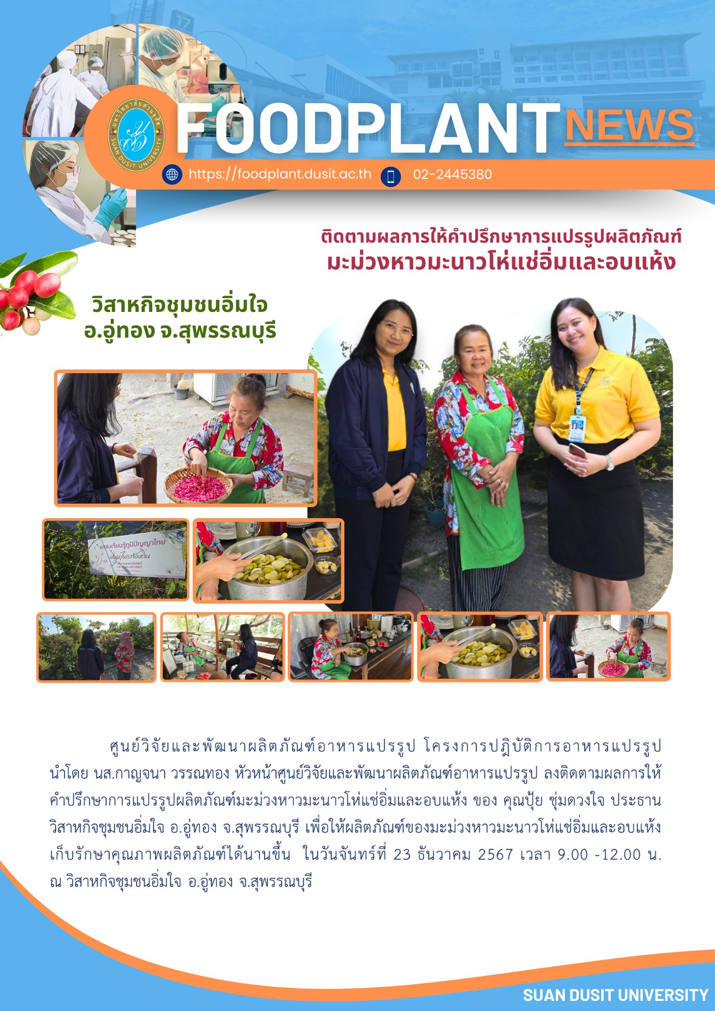 นำโดย นส.กาญจนา วรรณทอง หัวหน้าศูนย์วิจัยและพัฒนาผลิตภัณฑ์อาหารแปรรูป ลงติดตามผลการให้คำปรึกษาการแปรรูปผลิตภัณฑ์มะม่วงหาวมะนาวโห่แช่อิ่มและอบแห้ง ของ คุณปุ้ย ชุ่มดวงใจ ประธานวิสาหกิจชุมชนอิ่มใจ อ.อู่ทอง จ.สุพรรณบุรี