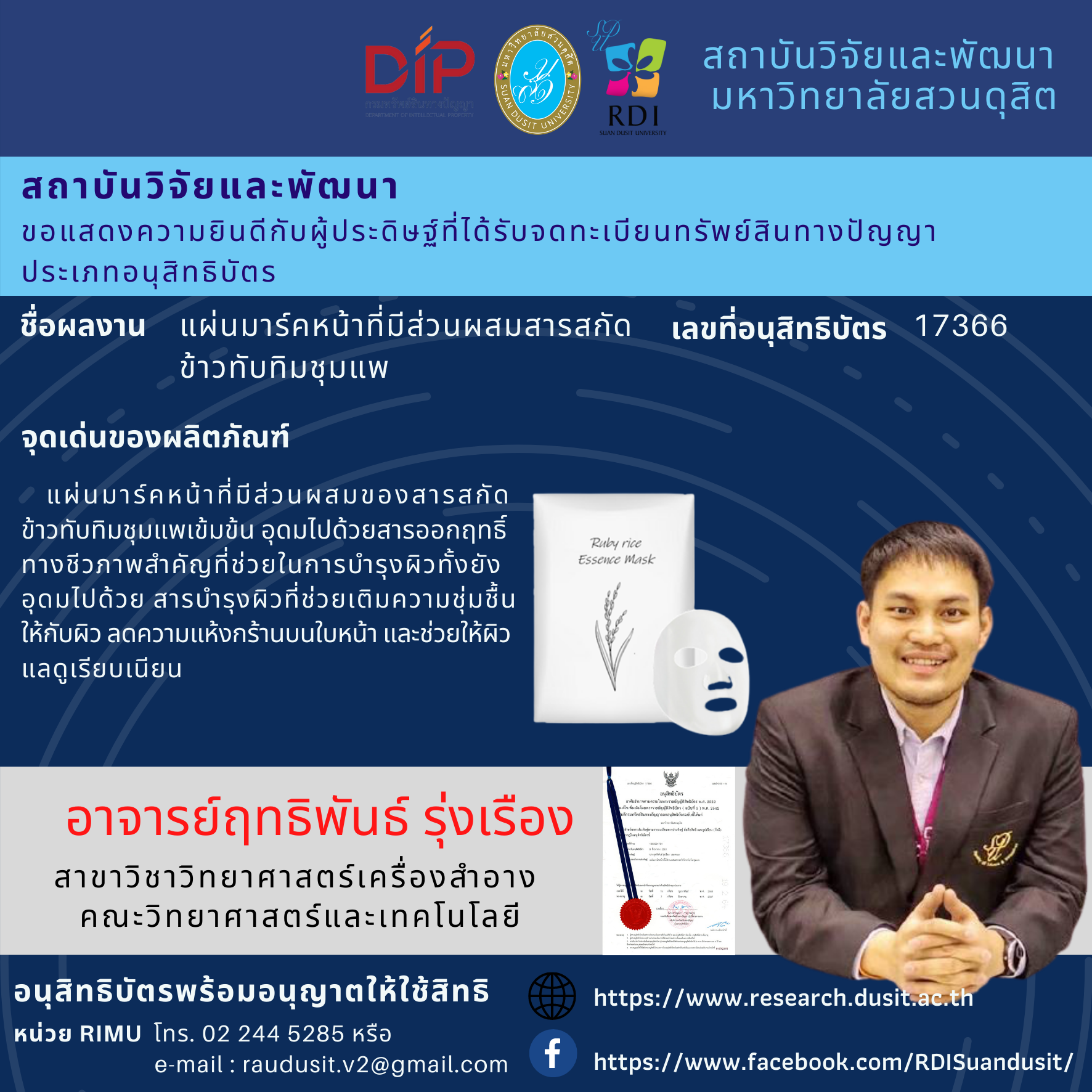 แผ่นมาร์คหน้าที่มีส่วนผสมสารสกัดข้าวทับทิมชุมแพ