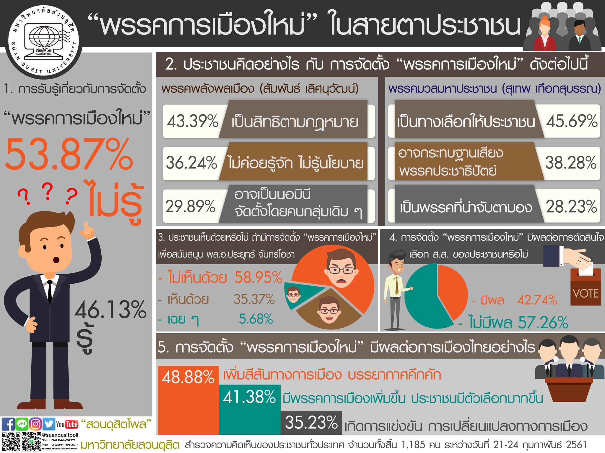 ผลสำรวจความคิดเห็นของประชาชน 1,185 คน เกี่ยวกับการตั้งพรรคการเมืองใหม่ ระหว่างวันที่ 21-24 กุมภาพันธ์ 2561 โดยมหาวิทยาลัยสวนดุสิต ผลสำรวจพบว่า ประชาชนส่วนใหญ่ (53.87%) ไม่รับรู้เกี่ยวกับการจัดตั้งพรรคการเมืองใหม่ เนื่องจากไม่ได้ติดตามข่าวและไม่สนใจ ส่วนผู้ที่รับรู้มี 46.13% ประชาชนส่วนใหญ่ (58.95%) ไม่เห็นด้วยกับการจัดตั้งพรรคการเมืองใหม่เพื่อสนับสนุน พล.อ.ประยุทธ์ เพราะเห็นว่าพรรคการเมืองควรเป็นอิสระและเป็นกลาง ส่วนใหญ่ (57.26%) เห็นว่าการจัดตั้งพรรคการเมืองใหม่ไม่มีผลต่อการตัดสินใจเลือก ส.ส. เพราะมีพรรคและบุคคลที่ชื่นชอบอยู่แล้ว ประชาชนมองว่าการจัดตั้งพรรคการเมืองใหม่จะช่วยเพิ่มสีสันทางการเมือง (48.88%) ทำให้มีตัวเลือกที่หลากหลายมากขึ้น (41.38%) และเกิดการแข่งขันมากขึ้น (35.23%) โดยพรรคมวลมหาประชาชนของนายสุเทพ เทือกสุบรรณ ถูกมองว่าเป็นทางเลือกใหม่แต่อาจกระทบฐานเสียงพรรคประชาธิปัตย์