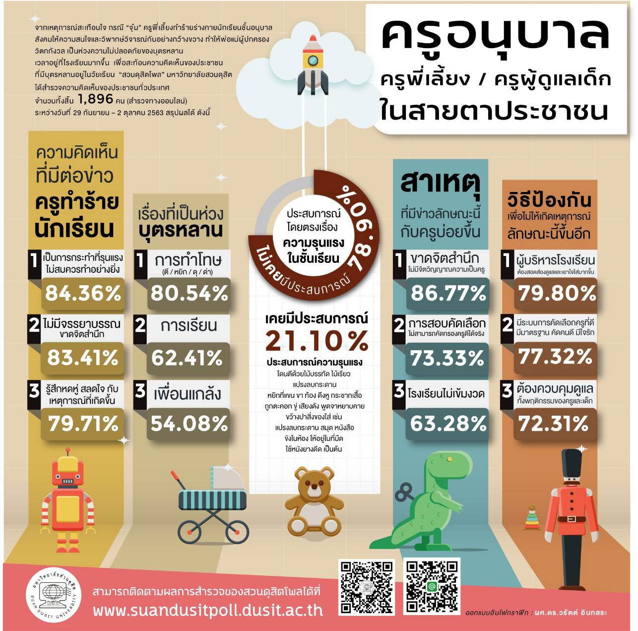 สวนดุสิตโพล มหาวิทยาลัยสวนดุสิต ได้สำรวจความคิดเห็นของประชาชนจำนวน 1,896 คน ระหว่างวันที่ 29 กันยายน – 2 ตุลาคม 2563 เพื่อตอบสนองต่อกรณีครูพี่เลี้ยงกระทำความรุนแรงต่อนักเรียน ซึ่งกลายเป็นกระแสสังคมที่ก่อให้เกิดความวิตกในหมู่ผู้ปกครอง ผลสำรวจพบว่า ร้อยละ 84.36 มองว่าการกระทำดังกล่าวรุนแรงเกินกว่าเหตุ และร้อยละ 86.77 เห็นว่าครูขาดจิตสำนึกและจิตวิญญาณของความเป็นครู สาเหตุหลักที่ทำให้เกิดเหตุการณ์เช่นนี้บ่อยขึ้น ได้แก่ ระบบการคัดเลือกครูที่ไม่มีประสิทธิภาพ และการบริหารภายในโรงเรียนที่ขาดความเข้มงวด ผู้ปกครองส่วนใหญ่กังวลเรื่องการลงโทษของครูเป็นอันดับแรก วิธีการแก้ไขควรเริ่มจากการเพิ่มความเข้มงวดของผู้บริหารโรงเรียนและการคัดกรองบุคลากรที่มีคุณภาพ ผลการสำรวจชี้ว่าปัญหาความรุนแรงในชั้นเรียนสะท้อนภาพลักษณ์เชิงลบต่อระบบการศึกษาที่ต้องได้รับการปฏิรูปอย่างจริงจัง