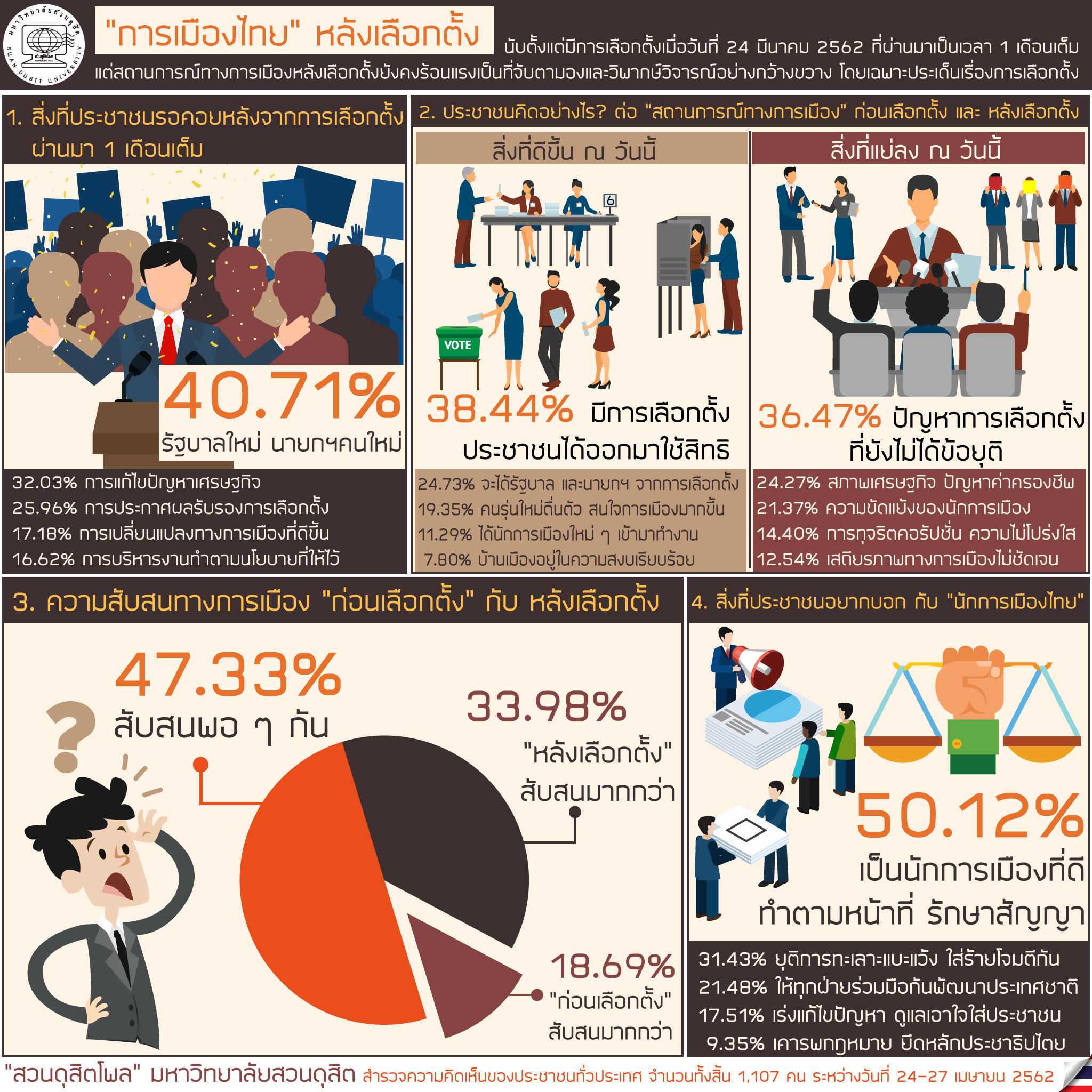 สวนดุสิตโพล มหาวิทยาลัยสวนดุสิต ได้สำรวจความคิดเห็นของประชาชนจำนวน 1,107 คนทั่วประเทศ ระหว่างวันที่ 24–27 เมษายน 2562 เพื่อสะท้อนมุมมองต่อสถานการณ์ “การเมืองไทยหลังเลือกตั้ง” 24 มีนาคม 2562 ผลสำรวจพบว่า สิ่งที่ประชาชนรอคอยมากที่สุดคือรัฐบาลและนายกรัฐมนตรีคนใหม่ (40.71%) รองลงมาคือการแก้ไขปัญหาเศรษฐกิจ (32.03%) และการประกาศรับรองผลเลือกตั้ง (25.96%) ด้านสิ่งที่ประชาชนมองว่าดีขึ้นคือการมีการเลือกตั้ง (38.44%) และการตื่นตัวทางการเมืองของคนรุ่นใหม่ (19.35%) อย่างไรก็ตาม ปัญหาที่แย่ลง ได้แก่ ความไม่ชัดเจนของกระบวนการเลือกตั้ง (36.47%) เศรษฐกิจและค่าครองชีพ (24.27%) รวมถึงความขัดแย้งระหว่างนักการเมือง (21.37%) ประชาชนส่วนใหญ่ (47.33%) มองว่าสถานการณ์ยังคงสับสนทั้งก่อนและหลังเลือกตั้ง ขณะที่ข้อเสนอสำคัญที่อยากบอกนักการเมือง คือการทำหน้าที่อย่างซื่อสัตย์และรักษาสัญญา (50.12%) และร่วมมือกันพัฒนาประเทศมากกว่าทะเลาะกัน (31.43%)