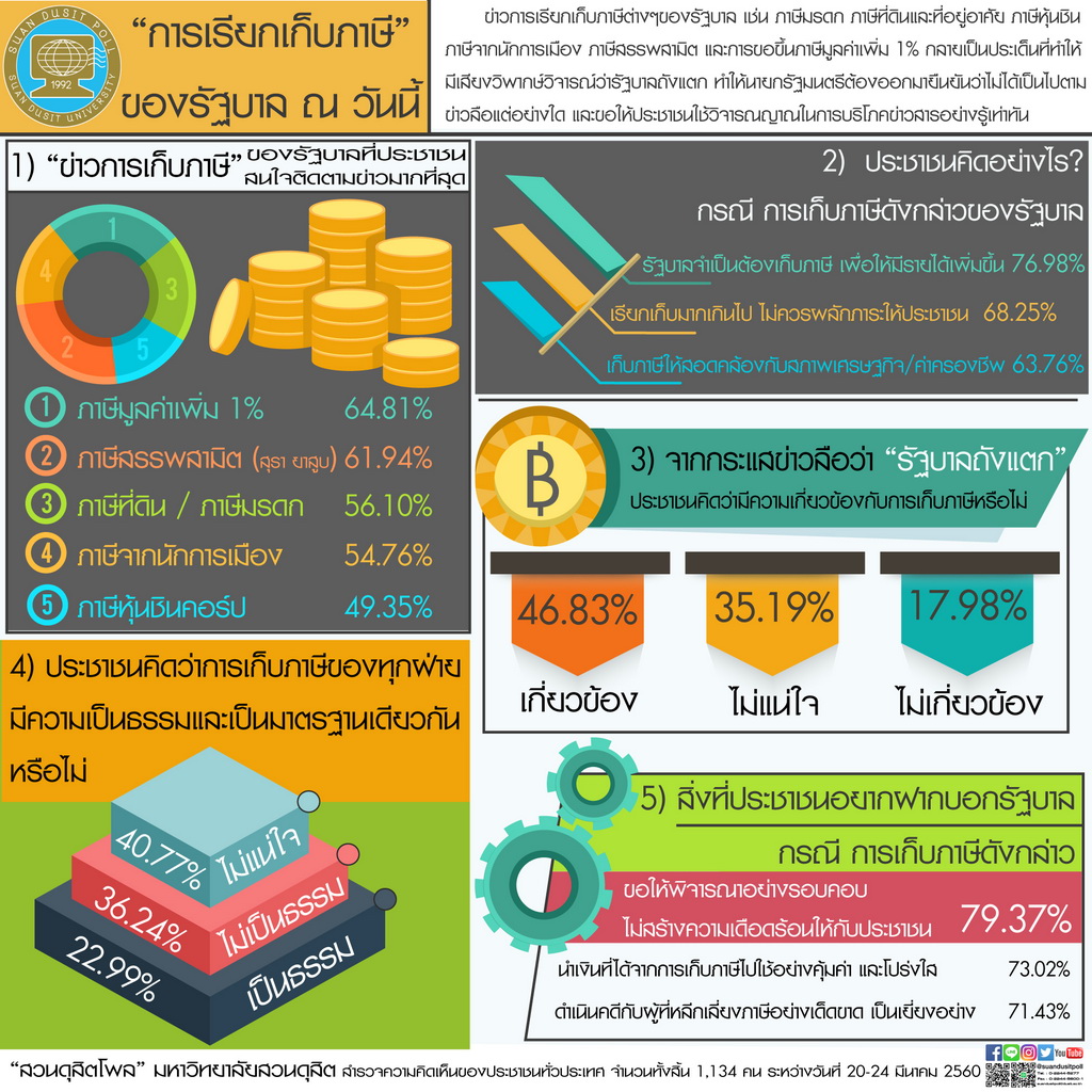 จากกระแสข่าวเกี่ยวกับการจัดเก็บภาษีรูปแบบใหม่ของรัฐบาล เช่น ภาษีมูลค่าเพิ่ม ภาษีที่ดินและมรดก ภาษีหุ้น ภาษีจากนักการเมือง และภาษีสรรพสามิต ซึ่งกลายเป็นประเด็นที่ก่อให้เกิดกระแสวิพากษ์วิจารณ์ในสังคม “สวนดุสิตโพล” ได้สำรวจความคิดเห็นของประชาชนจำนวน 1,134 คน ระหว่างวันที่ 20–24 มีนาคม 2560 ผลสำรวจพบว่า ภาษีที่ประชาชนติดตามข่าวมากที่สุดคือ ภาษีมูลค่าเพิ่ม 1% (64.81%) เพราะกระทบต่อชีวิตประจำวัน รองลงมาคือภาษีสรรพสามิต (61.94%) และภาษีที่ดิน/มรดก (56.10%) โดย 76.98% เห็นว่ารัฐบาลจำเป็นต้องเก็บภาษีเพื่อเพิ่มรายได้ แต่ 68.25% เห็นว่าเป็นการเก็บที่มากเกินไป และ 63.76% เรียกร้องให้เก็บภาษีสอดคล้องกับสภาพเศรษฐกิจ สำหรับข่าวลือเรื่อง “รัฐบาลถังแตก” ประชาชน 46.83% เชื่อว่าการเก็บภาษีเกี่ยวข้องกับฐานะการคลัง ขณะที่ 79.37% อยากให้รัฐบาลพิจารณาอย่างรอบคอบ ไม่สร้างภาระต่อประชาชน และใช้เงินภาษีอย่างโปร่งใสและคุ้มค่า