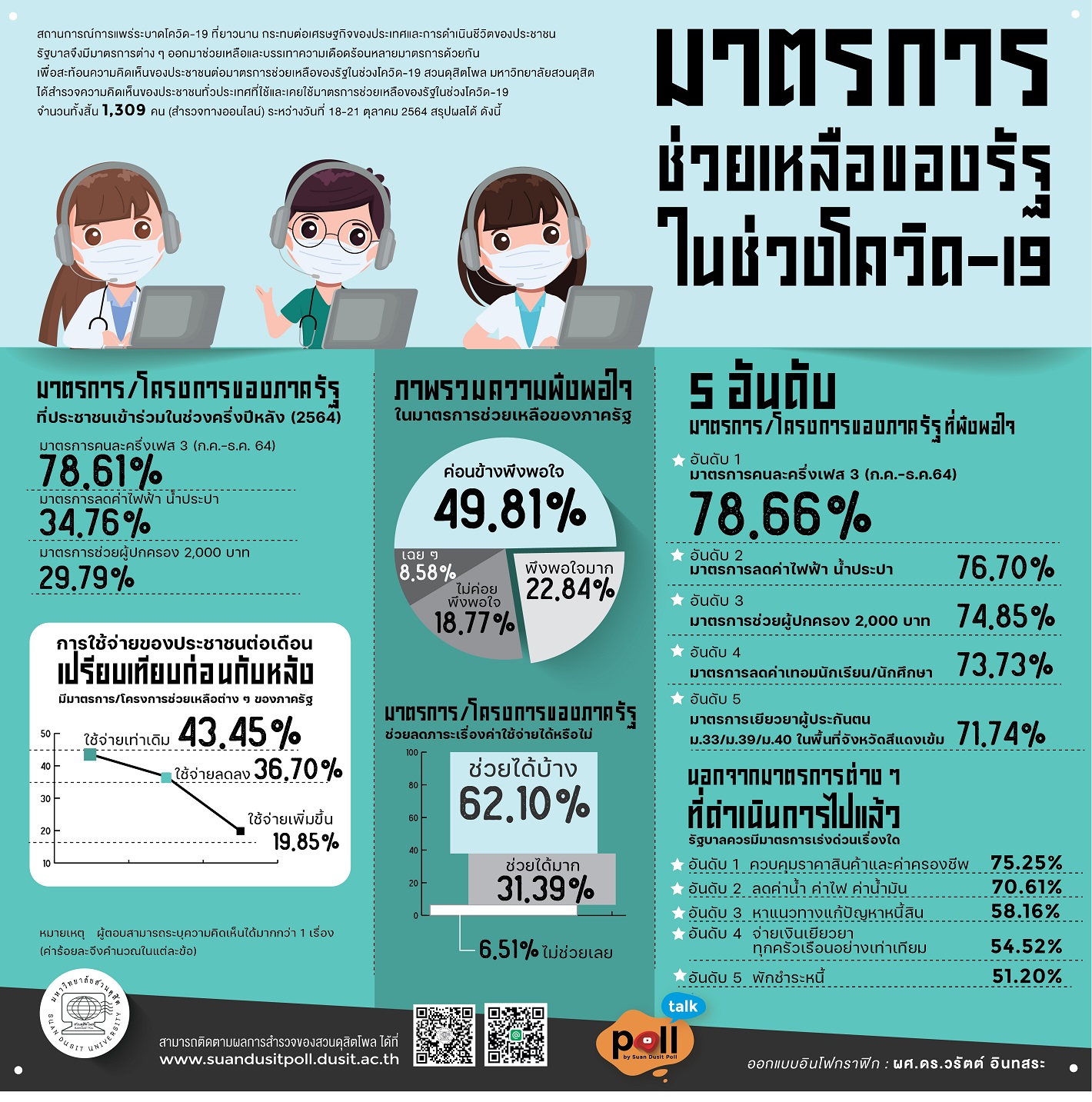 ท่ามกลางวิกฤตโควิด-19 ที่ส่งผลกระทบในทุกมิติของชีวิตประชาชน รัฐบาลได้ออกมาตรการช่วยเหลือต่าง ๆ เพื่อลดภาระค่าใช้จ่ายและฟื้นฟูเศรษฐกิจฐานราก สวนดุสิตโพล มหาวิทยาลัยสวนดุสิต ได้สำรวจความคิดเห็นประชาชนจำนวน 1,309 คน ระหว่างวันที่ 18–21 ตุลาคม พ.ศ. 2564 โดยพบว่า ประชาชนเข้าร่วม “มาตรการคนละครึ่งเฟส 3” มากที่สุด (78.61%) และมองว่ามาตรการนี้ช่วยลดภาระค่าใช้จ่ายได้ในระดับที่น่าพอใจ
