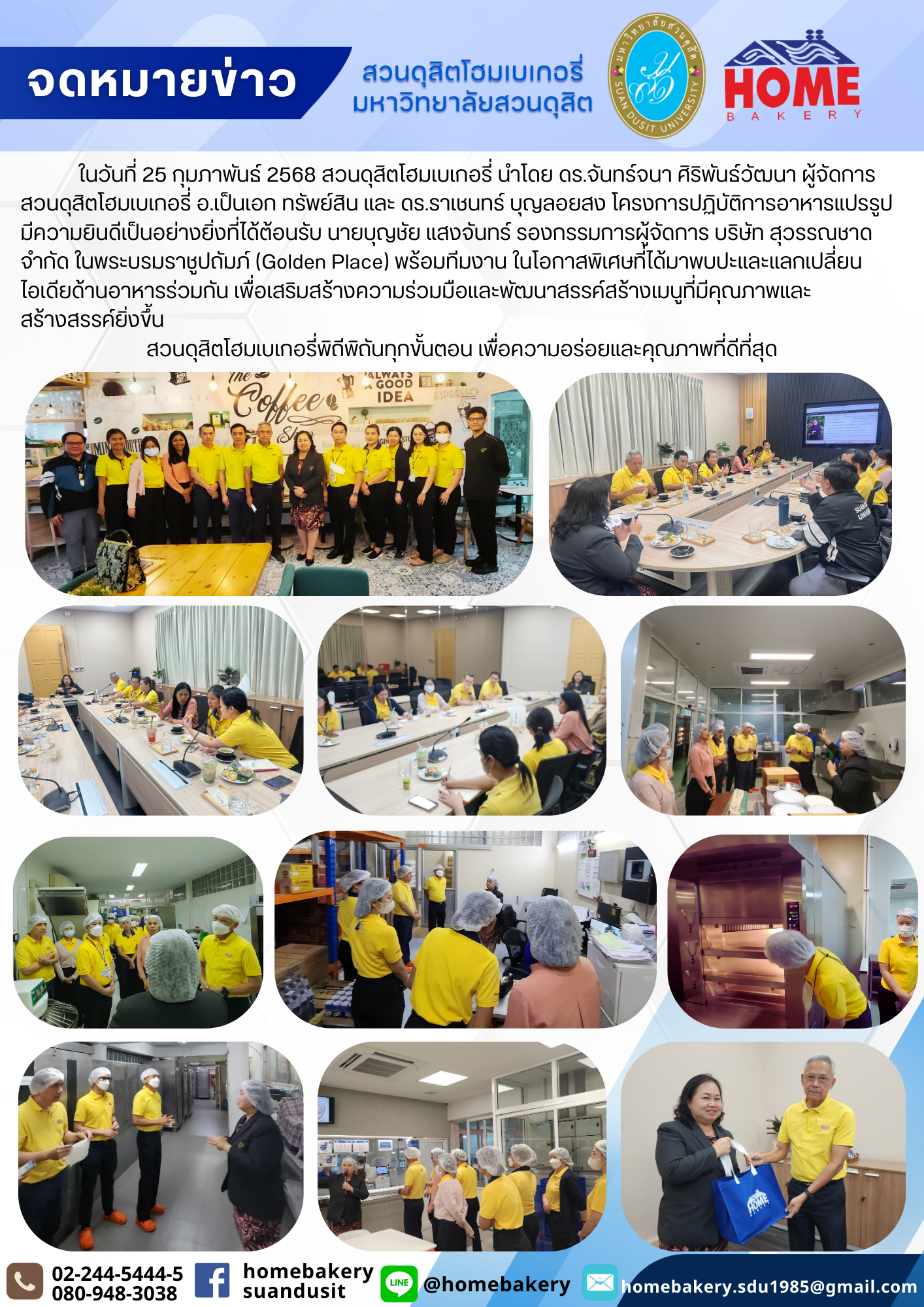 ในวันที่ 25 กุมภาพันธ์ 2568 สวนดุสิตโฮมเบเกอรี่ นำโดย ดร.จันทร์จนา ศิริพันธ์วัฒนา ผู้จัดการสวนดุสิตโฮมเบเกอรี่ อ.เป็นเอก ทรัพย์สิน และ ดร.ราเชนทร์ บุญลอยสง โครงการปฏิบัติการอาหารแปรรูป มีความยินดีเป็นอย่างยิ่งที่ได้ต้อนรับ นายบุญชัย แสงจันทร์ รองกรรมการผู้จัดการ บริษัท สุวรรณชาด จำกัด ในพระบรมราชูปถัมภ์ (Golden Place) พร้อมทีมงาน ในโอกาสพิเศษที่ได้มาพบปะและแลกเปลี่ยนไอเดียด้านอาหารร่วมกัน เพื่อเสริมสร้างความร่วมมือและพัฒนาสรรค์สร้างเมนูที่มีคุณภาพและสร้างสรรค์ยิ่งขึ้น สวนดุสิตโฮมเบเกอรี่พิถีพิถันทุกขั้นตอน เพื่อความอร่อยและคุณภาพที่ดีที่สุด