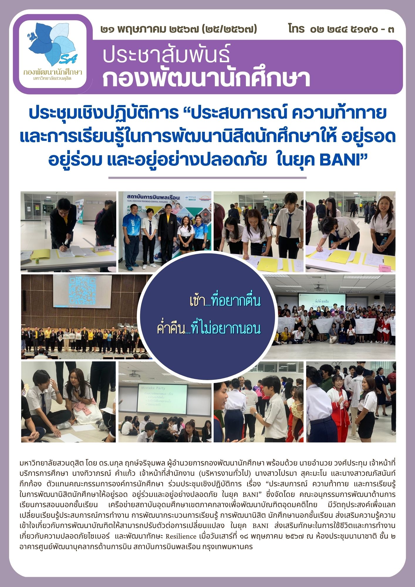 ประชุมเชิงปฏิบัติการ “ประสบการณ์ ความท้าทาย และการเรียนรู้ในการพัฒนานิสิตนักศึกษาให้ อยู่รอด อยู่ร่วม และอยู่อย่างปลอดภัย ในยุค BANI”