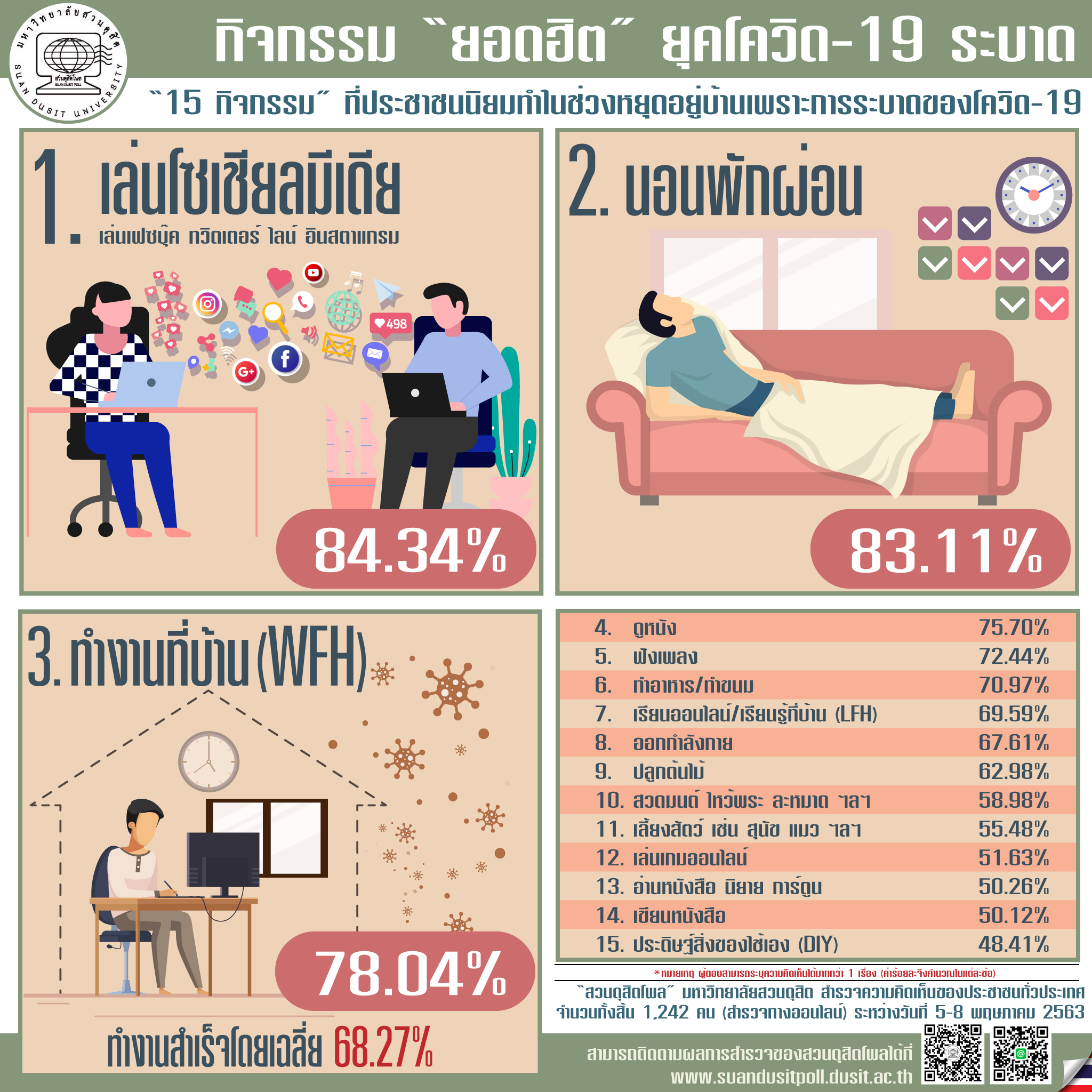 จากสถานการณ์การแพร่ระบาดของโควิด-19 รัฐบาลได้ขอความร่วมมือประชาชนให้อยู่บ้านและเว้นระยะห่างทางสังคม สวนดุสิตโพล มหาวิทยาลัยสวนดุสิต ได้สำรวจความคิดเห็นของประชาชนจำนวน 1,242 คน ระหว่างวันที่ 5–8 พฤษภาคม 2563 เพื่อสะท้อนกิจกรรมที่ได้รับความนิยมขณะอยู่บ้าน ผลสำรวจพบว่า กิจกรรมยอดฮิตอันดับต้น ๆ ได้แก่ การเล่นโซเชียลมีเดีย (ร้อยละ 84.34) การพักผ่อนนอนหลับ (ร้อยละ 83.11) การทำงานจากที่บ้าน (ร้อยละ 78.04) การดูหนัง ฟังเพลง และทำอาหาร นอกจากนี้ ยังมีกิจกรรมเสริมสร้างสุขภาวะ เช่น การปลูกต้นไม้ ออกกำลังกาย สวดมนต์ และเรียนรู้ออนไลน์ โดยเฉลี่ยประชาชนระบุว่าสามารถทำงานจากบ้านได้สำเร็จร้อยละ 68.27 สะท้อนการปรับตัวของคนไทยในภาวะวิกฤต และการพัฒนาวิถีชีวิตแบบใหม่ที่ยืดหยุ่นและสร้างสมดุล