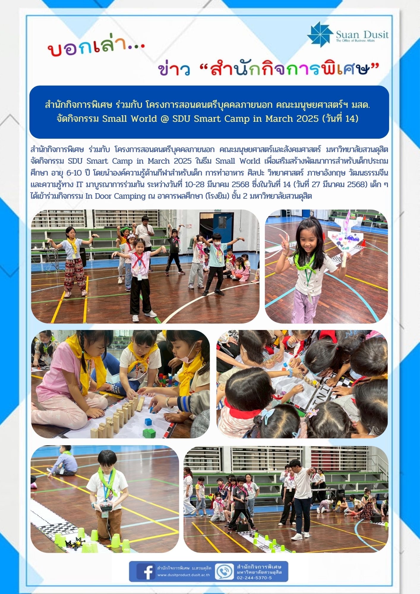 สำนักกิจการพิเศษ ร่วมกับ โครงการสอนดนตรีบุคคลภายนอก คณะมนุษยศาสตร์และสังคมศาสตร์ มหาวิทยาลัยสวนดุสิต จัดกิจกรรม SDU Smart Camp in March 2025 ในธีม Small World เพื่อเสริมสร้างพัฒนาการสำหรับเด็กประถมศึกษา อายุ 6-10 ปี โดยนำองค์ความรู้ด้านกีฬาสำหรับเด็ก การทำอาหาร ศิลปะ วิทยาศาสตร์ ภาษาอังกฤษ วัฒนธรรมจีน และความรู้ทาง IT มาบูรณาการร่วมกัน ระหว่างวันที่ 10-28 มีนาคม 2568 ซึ่งในวันที่ 14 (วันที่ 27 มีนาคม 2568)