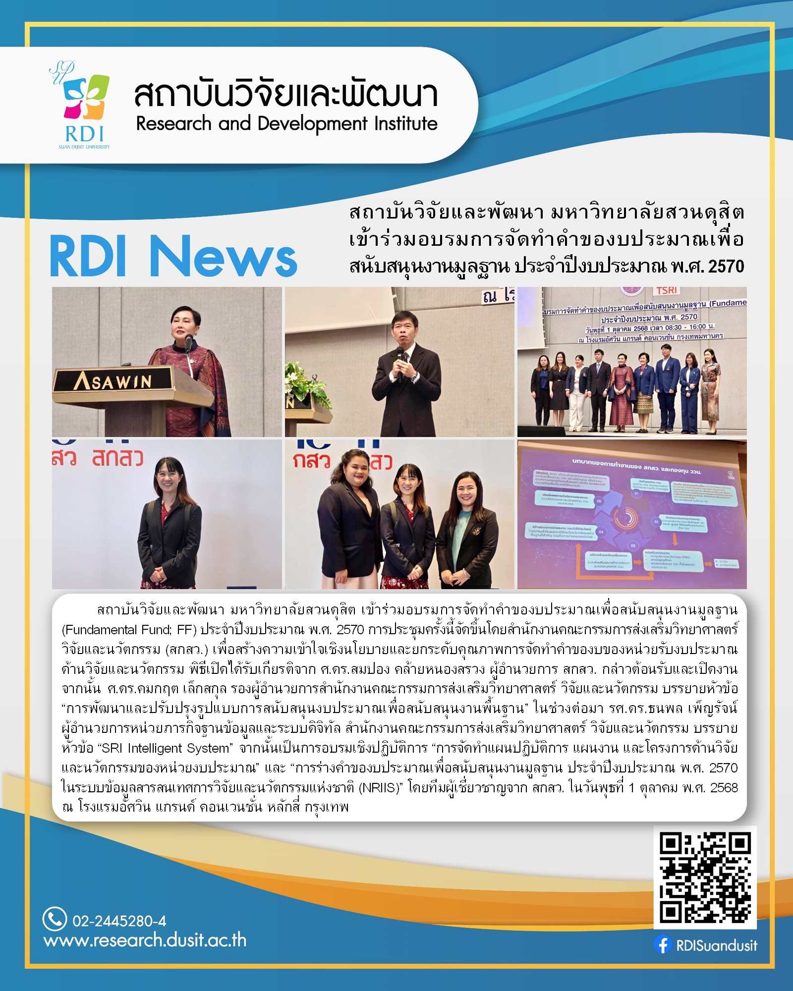 สถาบันวิจัยและพัฒนา มหาวิทยาลัยสวนดุสิต เข้าร่วมอบรมการจัดทำคำของบประมาณเพื่อสนับสนุนงานมูลฐาน (Fundamental Fund; FF) ประจำปีงบประมาณ พ.ศ. 2570 การประชุมครั้งนี้จัดขึ้นโดยสำนักงานคณะกรรมการส่งเสริมวิทยาศาสตร์ วิจัยและนวัตกรรม (สกสว.) เพื่อสร้างความเข้าใจเชิงนโยบายและยกระดับคุณภาพการจัดทำคำของบของหน่วยรับงบประมาณด้านวิจัยและนวัตกรรม พิธีเปิดได้รับเกียรติจาก ศ.ดร.สมปอง คล้ายหนองสรวง ผู้อำนวยการ สกสว. กล่าวต้อนรับและเปิดงาน จากนั้น ศ.ดร.คมกฤต เล็กสกุล รองผู้อำนวยการสำนักงานคณะกรรมการส่งเสริมวิทยาศาสตร์ วิจัยและนวัตกรรม บรรยายหัวข้อ “การพัฒนาและปรับปรุงรูปแบบการสนับสนุนงบประมาณเพื่อสนับสนุนงานพื้นฐาน” ในช่วงต่อมา รศ.ดร.ธนพล เพ็ญรัจน์ ผู้อำนวยการหน่วยภารกิจฐานข้อมูลและระบบดิจิทัล สำนักงานคณะกรรมการส่งเสริมวิทยาศาสตร์ วิจัยและนวัตกรรม บรรยายหัวข้อ “SRI Intelligent System” จากนั้นเป็นการอบรมเชิงปฏิบัติการ “การจัดทำแผนปฏิบัติการ แผนงาน และโครงการด้านวิจัยและนวัตกรรมของหน่วยงบประมาณ” และ “การร่างคำของบประมาณเพื่อสนับสนุนงานมูลฐาน ประจำปีงบประมาณ พ.ศ. 2570 ในระบบข้อมูลสารสนเทศการวิจัยและนวัตกรรมแห่งชาติ (NRIIS)” โดยทีมผู้เชี่ยวชาญจาก สกสว. ในวันพุธที่ 1 ตุลาคม พ.ศ. 2568 ณ โรงแรมอัศวิน แกรนด์ คอนเวนชั่น หลักสี่ กรุงเทพ