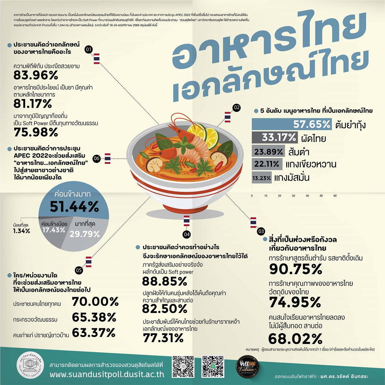 งานวิจัยเชิงสำรวจของสวนดุสิตโพล มหาวิทยาลัยสวนดุสิต ได้ศึกษาความคิดเห็นของประชาชนเกี่ยวกับเอกลักษณ์ของอาหารไทยจากกลุ่มตัวอย่างจำนวน 1,044 คนทั่วประเทศ ผลการศึกษาพบว่าเอกลักษณ์สำคัญของอาหารไทยคือความพิถีพิถัน ความประณีต และความสวยงาม ซึ่งสะท้อนถึงวัฒนธรรมไทยผ่านอาหารได้อย่างชัดเจน เมนูอาหารที่ได้รับการยกย่องว่าเป็นเอกลักษณ์ไทยมากที่สุด ได้แก่ ต้มยำกุ้ง ผัดไทย และส้มตำ อย่างไรก็ตาม มีความกังวลเรื่องการสูญเสียสูตรดั้งเดิมและรสชาติแท้ของอาหารไทยจากการปรับเปลี่ยนตามกระแสนิยม งานวิจัยชี้ว่า “อาหารไทย” ควรถูกส่งเสริมในฐานะ Soft Power โดยรัฐต้องมีบทบาทผลักดันอย่างจริงจังควบคู่กับการสร้างความตระหนักในกลุ่มคนรุ่นใหม่ ภาคการศึกษาและชุมชนท้องถิ่นควรร่วมกันรักษา ถ่ายทอด และประชาสัมพันธ์เอกลักษณ์ของอาหารไทยผ่านการเล่าเรื่องและสื่อดิจิทัล เพื่อความยั่งยืนและการรับรู้ในระดับนานาชาติ