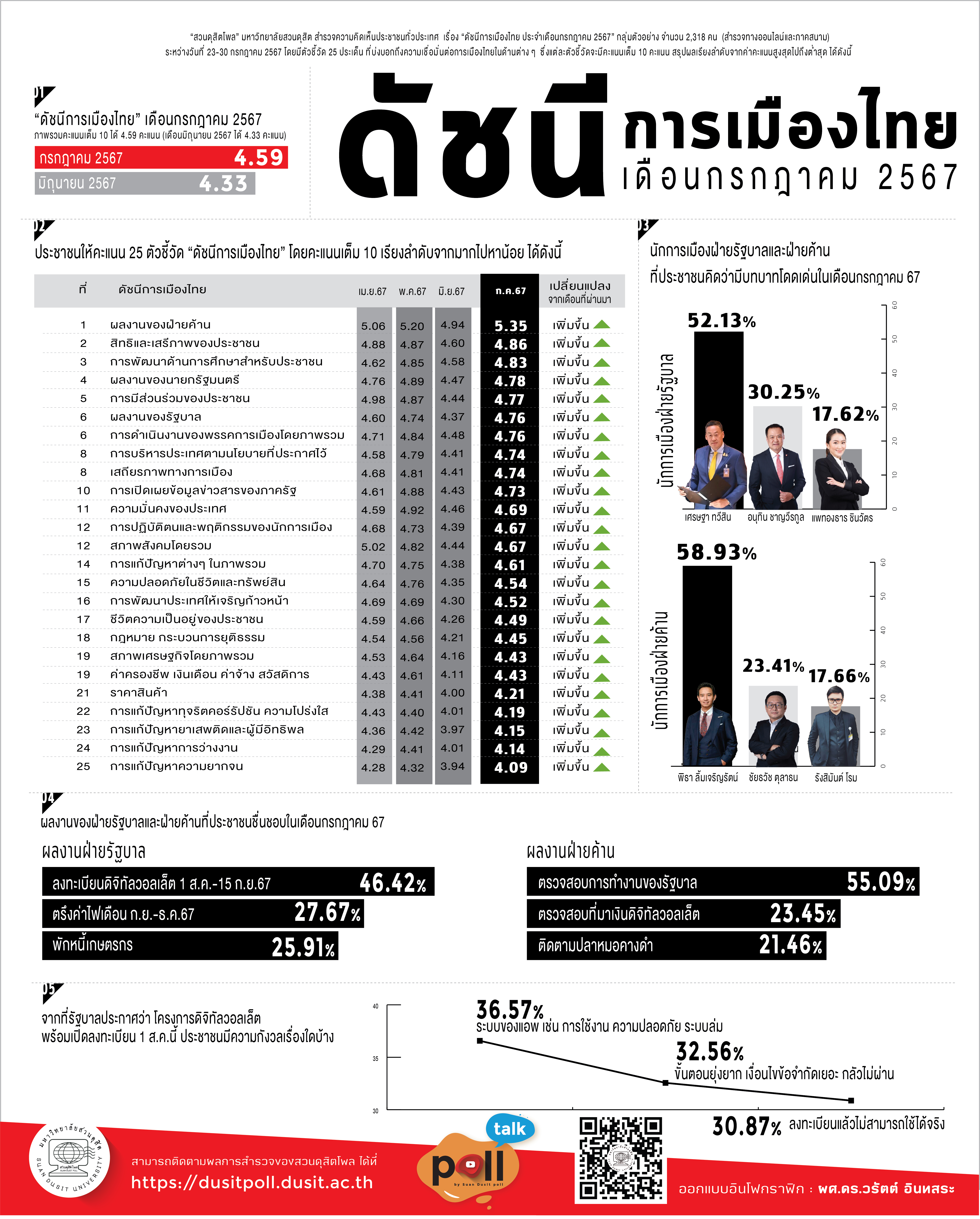 สวนดุสิตโพล มหาวิทยาลัยสวนดุสิต สำรวจความคิดเห็นประชาชนทั่วประเทศ เรื่อง “ดัชนีการเมืองไทย ประจำเดือนกรกฎาคม 2567” กลุ่มตัวอย่าง จำนวน 2,318 คน (สำรวจทางออนไลน์และภาคสนาม) ระหว่างวันที่ 23-30 กรกฎาคม 2567 พบว่า กลุ่มตัวอย่างให้คะแนนภาพรวมดัชนีการเมืองไทยประจำเดือนกรกฎาคม 2567 เฉลี่ย 4.59 คะแนน เพิ่มขึ้นจากเดือนมิถุนายน 2567 ที่ได้ 4.33 คะแนน