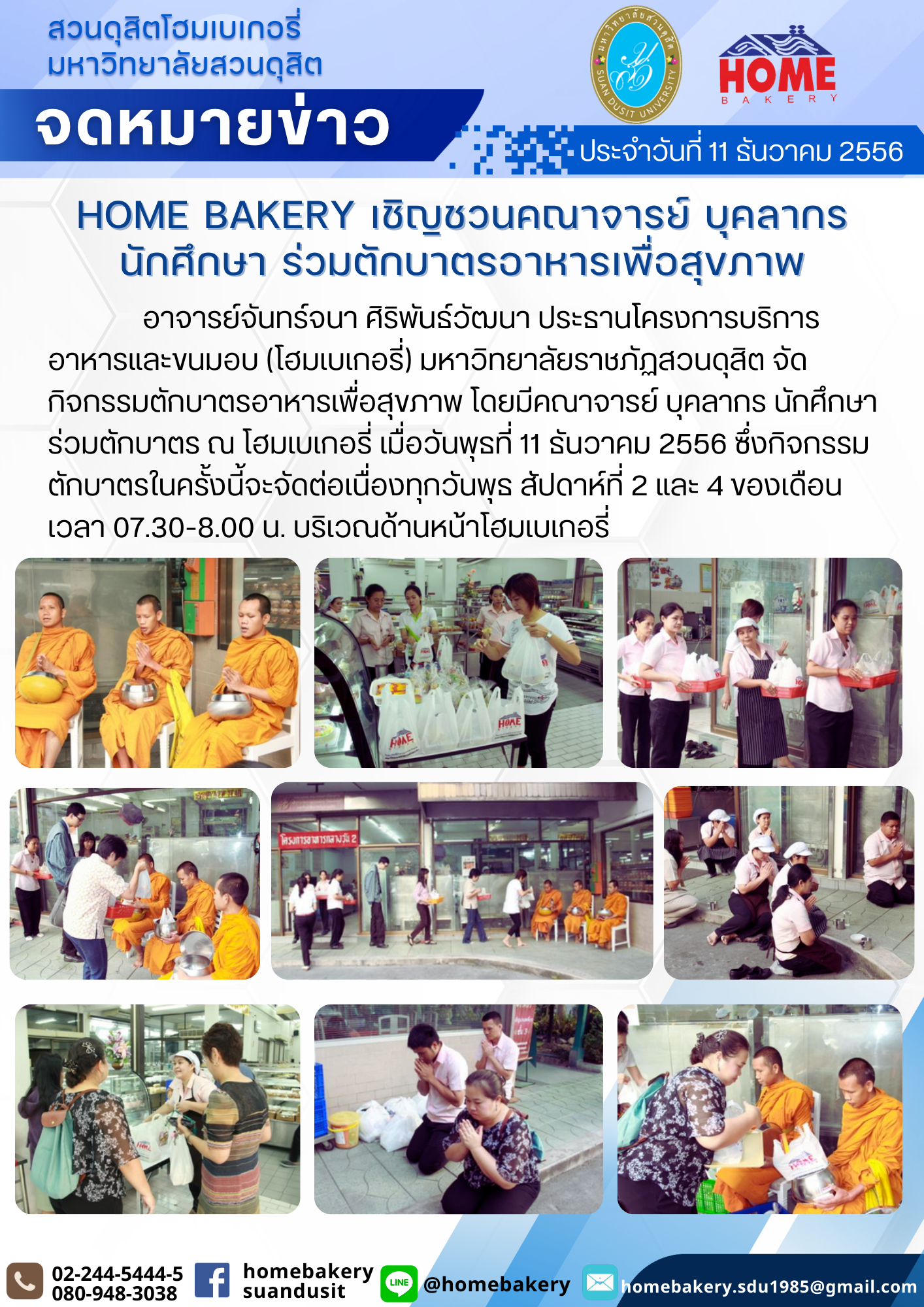 อาจารย์จันทร์จนา ศิริพันธ์วัฒนา ประธานโครงการ บริการอาหารและขนมอบ (โฮมเบเกอรี่) มหาวิทยาลัยราชภัฏสวนดุสิต จัดกิจกรรมตักบาตรอาหารเพื่อสุขภาพ โดยมีคณาจารย์ บุคลากร นักศึกษา ร่วมตักบาตร ณ โฮมเบเกอรี่ เมื่อวันพุธที่ 11 ธันวาคม 2556 ซึ่งกิจกรรมตักบาตรในครั้งนี้จะจัดต่อเนื่องทุกวันพุธ สัปดาห์ที่ 2 และ 4 ของเดือน เวลา 07.30-8.00 น. บริเวณด้านหน้าโฮมเบเกอรี่