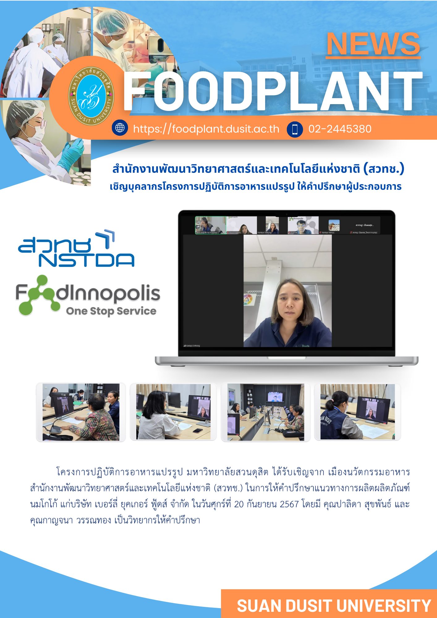 | dc.description.abstract | โครงการปฏิบัติการอาหารแปรรูป มหาวิทยาลัยสวนดุสิต ได้รับเชิญจาก เมืองนวัตกรรมอาหาร สำนักงานพัฒนาวิทยาศาสตร์และเทคโนโลยีแห่งชาติ (สวทช.) ในการให้คำปรึกษาแนวทางการผลิตผลิตภัณฑ์นมโกโก้ แก่บริษัท เบอร์ลี่ ยุคเกอร์ ฟู้ดส์ จำกัด ในวันศุกร์ที่ 20 กันยายน 2567 โดยมี คุณปาลิดา สุขพันธ์ และคุณกาญจนา วรรณทอง เป็นวิทยากรให้คำปรึกษา | |