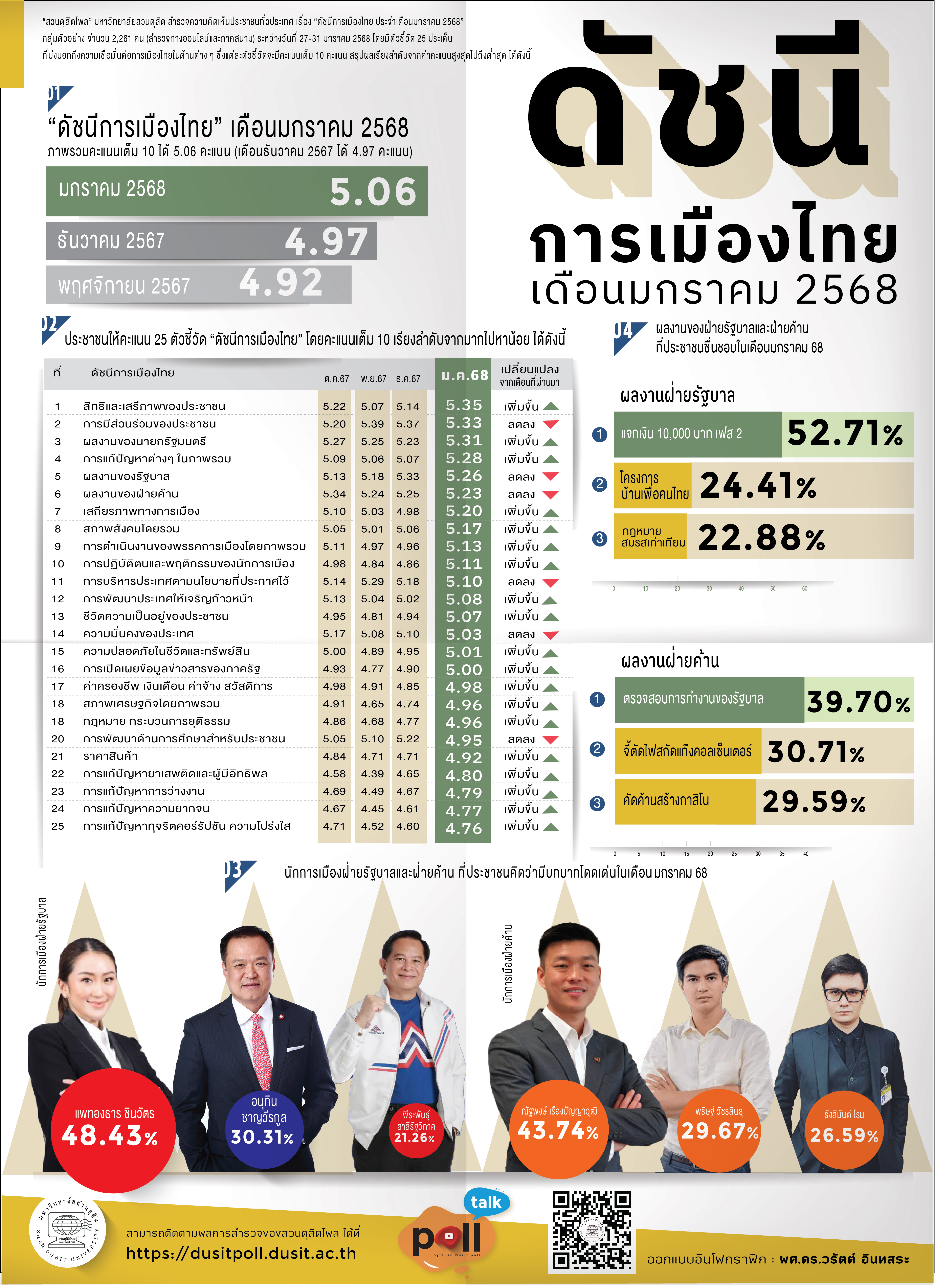 สวนดุสิตโพล มหาวิทยาลัยสวนดุสิต สำรวจความคิดเห็นประชาชนทั่วประเทศ เรื่อง “ดัชนีการเมืองไทย ประจำเดือนมกราคม 2568” กลุ่มตัวอย่าง จำนวน 2,261 คน (สำรวจทางออนไลน์และภาคสนาม) ระหว่างวันที่ 27-31 มกราคม 2568 พบว่า กลุ่มตัวอย่างให้คะแนนภาพรวมดัชนีการเมืองไทยประจำเดือนมกราคม 2568 เฉลี่ย 5.06 คะแนน เพิ่มขึ้นจากเดือนธันวาคม 2567 ที่ได้ 4.97 คะแนน