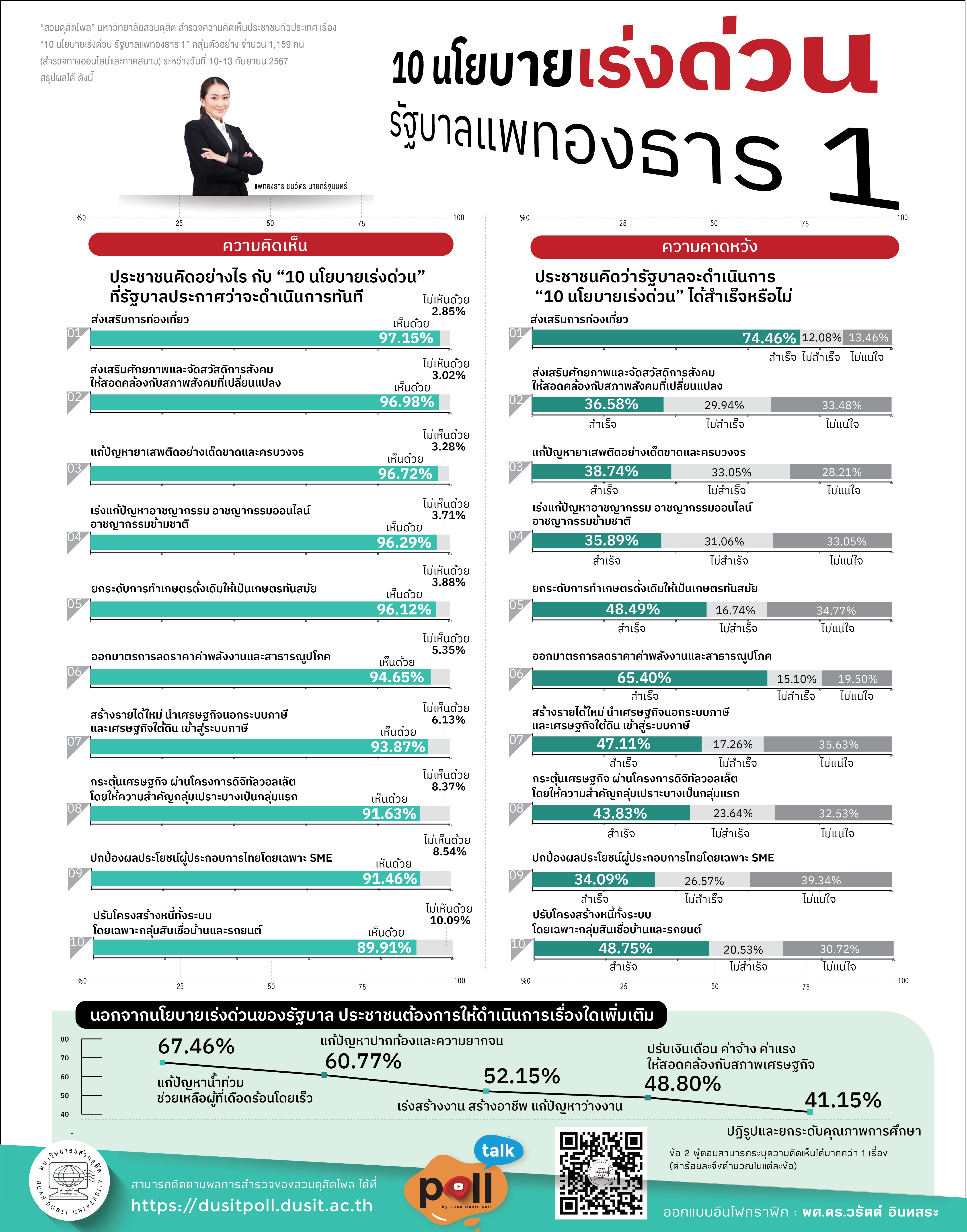 สวนดุสิตโพล มหาวิทยาลัยสวนดุสิต สำรวจความคิดเห็นประชาชนทั่วประเทศ เรื่อง “10 นโยบายเร่งด่วน รัฐบาลแพทองธาร 1” ระหว่างวันที่ 10-13 กันยายน 2567 กลุ่มตัวอย่าง จำนวน 1,159 คน สำรวจผ่านทางออนไลน์และภาคสนาม พบว่า จาก 10 นโยบายเร่งด่วนของรัฐบาล กลุ่มตัวอย่างเห็นด้วยกับทุกนโยบาย โดยเห็นด้วยกับนโยบายส่งเสริมการท่องเที่ยวมากที่สุด ร้อยละ 97.15 โดยคิดว่าเป็นนโยบายที่คาดว่าน่าจะทำได้สำเร็จ ร้อยละ 74.46 อีกนโยบายที่คาดว่าน่าจะทำได้สำเร็จ คือ นโยบายออกมาตรการลดราคาค่าพลังงานและสาธารณูปโภค ร้อยละ 65.40 นอกจากนี้กลุ่มตัวอย่างมองว่านโยบายแก้ปัญหายาเสพติดและอาชญากรรมออนไลน์นั้นน่าจะเป็นเรื่องที่ไม่น่าจะทำได้สำเร็จ ร้อยละ 33.05 และร้อยละ 31.06 ตามลำดับ นอกจาก 10 นโยบายแล้วก็อยากให้เร่งแก้ปัญหาน้ำท่วม ช่วยเหลือผู้ที่เดือดร้อนโดยเร็ว ร้อยละ 67.46