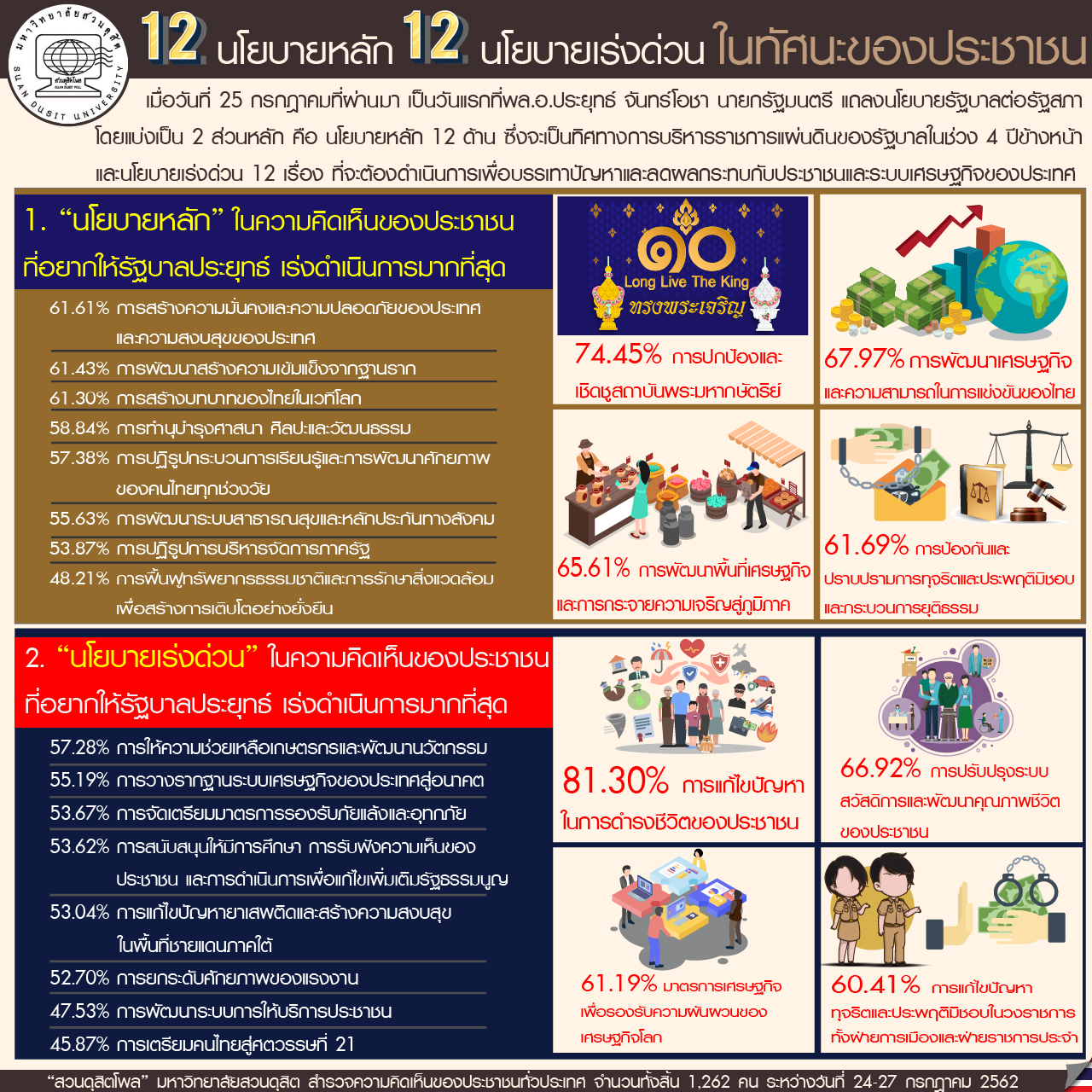 จากการแถลงนโยบายของรัฐบาลประยุทธ์ต่อรัฐสภา เมื่อวันที่ 25 กรกฎาคม 2562 ซึ่งประกอบด้วยนโยบายหลัก 12 ด้าน และนโยบายเร่งด่วนอีก 12 เรื่อง ได้รับความสนใจจากประชาชนเป็นอย่างมาก ผลสำรวจจากประชาชน 1,262 คน ระหว่างวันที่ 24–27 กรกฎาคม 2562 พบว่า นโยบายหลักที่ประชาชนต้องการให้เร่งดำเนินการมากที่สุดคือ การปกป้องและเชิดชูสถาบันพระมหากษัตริย์ (74.45%) รองลงมาคือการพัฒนาเศรษฐกิจและขีดความสามารถในการแข่งขัน (67.97%) และการกระจายความเจริญสู่ภูมิภาค (65.61%) ด้านนโยบายเร่งด่วน ประชาชนให้ความสำคัญกับการแก้ไขปัญหาค่าครองชีพและความเป็นอยู่ (81.30%) การปรับปรุงระบบสวัสดิการ (66.92%) และมาตรการรองรับเศรษฐกิจโลก (61.19%) สะท้อนให้เห็นว่าประชาชนคาดหวังต่อการดำเนินนโยบายที่ครอบคลุมทั้งด้านเศรษฐกิจ สังคม และคุณภาพชีวิต โดยมุ่งหวังให้เกิดการเปลี่ยนแปลงที่เป็นรูปธรรมในระยะเวลาอันใกล้