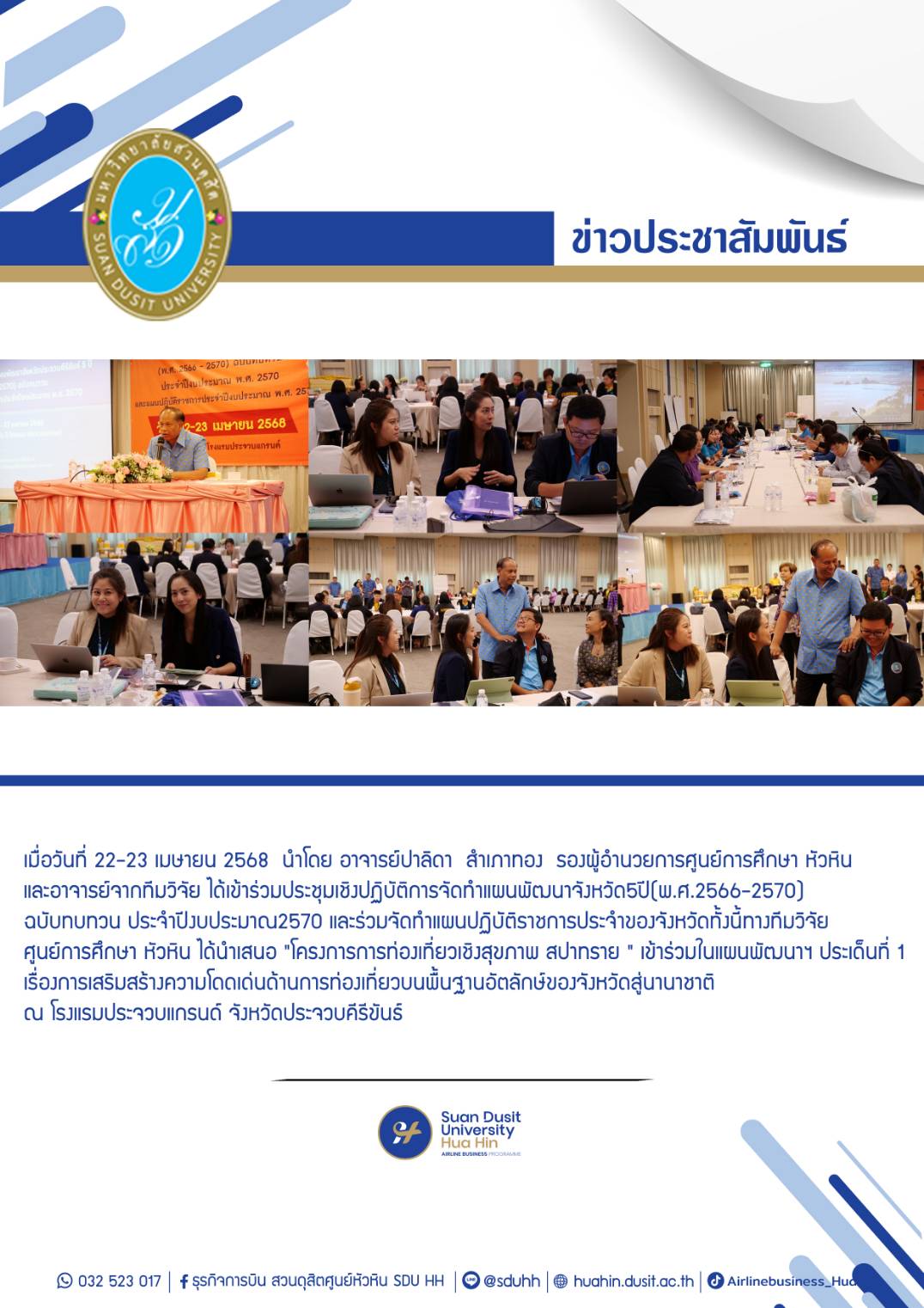 เมื่อวันที่ 22-23 เมษายน 2568 นำโดย อาจารย์ปาลิดา สำเภาทอง รองผู้อำนวยการศูนย์การศึกษา หัวหิน และอาจารย์จากทีมวิจัย ได้เข้าร่วมประชุมเชิงปฏิบัติการจัดทำแผนพัฒนาจังหวัด 5 ปี(พ.ศ.2566-2570) ฉบับทบทวน ประจำปีงบประมาณ 2570 และร่วมจัดทำแผนปฏิบัติราชการประจำของจังหวัดทั้งนี้ทางทีมวิจัย ศูนย์การศึกษา หัวหิน ได้นำเสนอ "โครงการการท่องเที่ยวเชิงสุขภาพ สปาทราย " เข้าร่วมในแผนพัฒนาฯ ประเด็นที่ 1 เรื่องการเสริมสร้างความโดดเด่นด้านการท่องเที่ยวบนพื้นฐานอัตลักษ์ของจังหวัดสู่นานาชาติ ณ โรงแรมประจวบแกรนด์ จังหวัดประจวบคีรีขันธ์