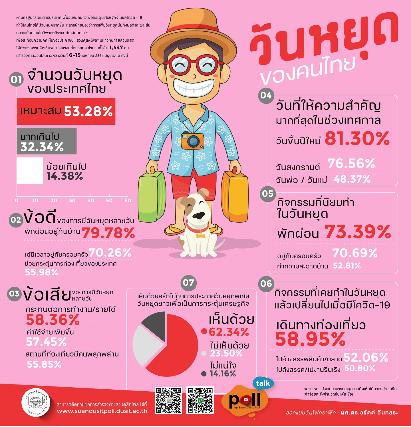 สวนดุสิตโพล มหาวิทยาลัยสวนดุสิต ได้สำรวจความคิดเห็นของประชาชนจำนวน 1,447 คน ระหว่างวันที่ 6–15 เมษายน 2564 เรื่อง “วันหยุดของคนไทย” ในบริบทที่รัฐบาลเพิ่มวันหยุดพิเศษเพื่อกระตุ้นเศรษฐกิจช่วงโควิด-19 พบว่า ประชาชนส่วนใหญ่เห็นว่าวันหยุดในประเทศไทยมีความเหมาะสม (53.28%) โดยให้ความสำคัญมากที่สุดกับวันขึ้นปีใหม่และวันสงกรานต์ กิจกรรมยอดนิยมในวันหยุด ได้แก่ การพักผ่อน อยู่กับครอบครัว และทำความสะอาดบ้าน ขณะที่กิจกรรมที่เปลี่ยนแปลงไปเมื่อเกิดโควิด-19 คือ การเดินทางท่องเที่ยวและการสังสรรค์ แม้ประชาชนเห็นด้วยกับการประกาศวันหยุดพิเศษ (62.34%) แต่ก็สะท้อนว่ามีผลกระทบด้านรายได้และค่าใช้จ่ายที่เพิ่มขึ้น มาตรการเพิ่มวันหยุดจึงเป็นแนวทางที่ “ถูกใจแต่ยังไม่ทั่วถึง” รัฐควรพิจารณาความสมดุลระหว่างการฟื้นเศรษฐกิจและความมั่นคงทางการเงินของประชาชน เพื่อให้เกิดประโยชน์ในวงกว้างและตอบโจทย์ทั้งด้านสังคมและเศรษฐกิจอย่างยั่งยืน