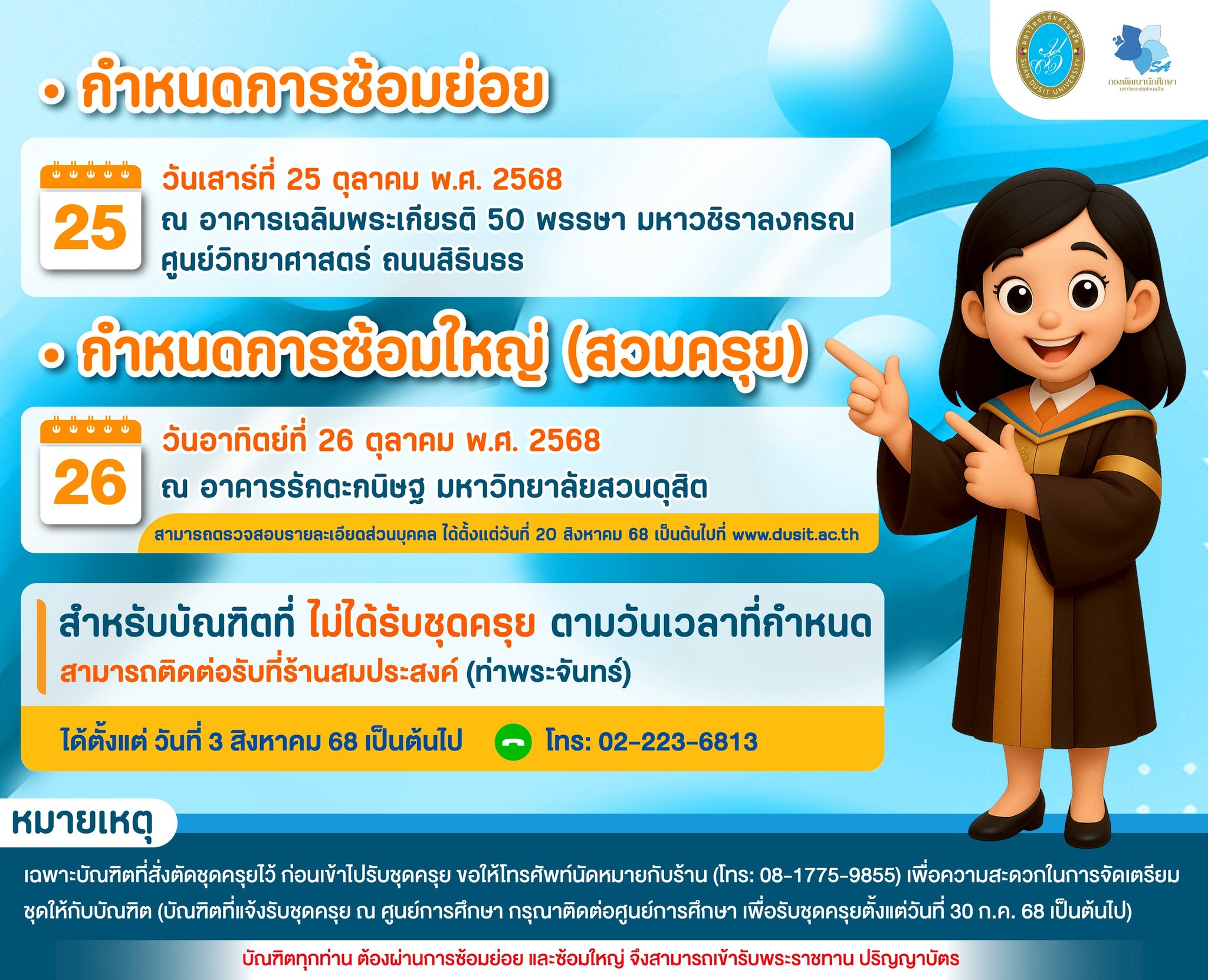 ประกาศจากมหาวิทยาลัยสวนดุสิตเกี่ยวกับกำหนดการซ้อมย่อยและซ้อมใหญ่ สำหรับผู้ที่จะเข้ารับพระราชทานปริญญาบัตร ประจำปี พ.ศ. 2568 โดยมีการซ้อมย่อยในวันที่ 25 ตุลาคม 2568 และซ้อมใหญ่ในวันที่ 26 ตุลาคม 2568 พร้อมแนะแนวทางการติดต่อกรณีบัณฑิตยังไม่ได้รับชุดครุย และข้อปฏิบัติสำคัญสำหรับการเข้าร่วมพิธี