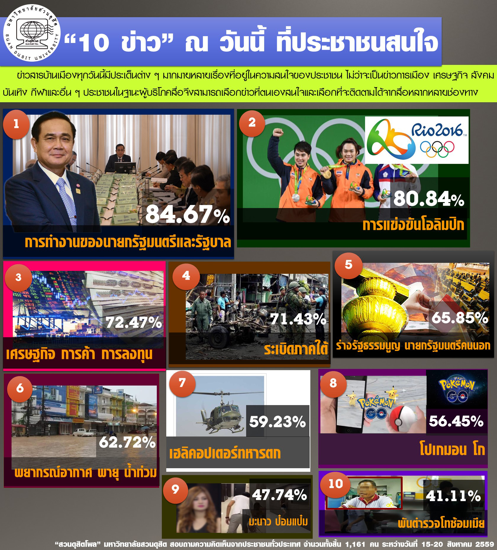 สวนดุสิตโพลได้สำรวจความคิดเห็นของประชาชนทั่วประเทศจำนวน 1,161 คน ระหว่างวันที่ 15–20 สิงหาคม 2559 เพื่อสะท้อนความสนใจของประชาชนต่อประเด็นข่าวสารในสังคม ผลการสำรวจพบว่า ข่าวที่ได้รับความสนใจมากที่สุดคือ การทำงานของนายกรัฐมนตรีและรัฐบาล ซึ่งประชาชนต้องการรับรู้แนวทางการบริหารและแก้ไขปัญหาของประเทศ รองลงมาคือข่าวการแข่งขันโอลิมปิกที่สร้างความภาคภูมิใจให้กับคนไทย และข่าวเศรษฐกิจที่มีผลกระทบต่อชีวิตประจำวัน เช่น ค่าครองชีพและรายได้ นอกจากนี้ ยังมีความสนใจต่อเหตุการณ์รุนแรงในภาคใต้ ข่าวเกี่ยวกับร่างรัฐธรรมนูญ นายกรัฐมนตรีคนนอก และข่าวภัยธรรมชาติเช่น พายุ น้ำท่วม ประชาชนยังติดตามข่าวอุบัติเหตุทางทหาร เกมยอดฮิตอย่าง “โปเกมอน โก” และข่าวทางสังคมที่สะท้อนพฤติกรรมและปัญหาในครอบครัว ทั้งนี้ ข้อมูลจากการสำรวจสามารถนำไปใช้เป็นแนวทางในการพัฒนาการนำเสนอข่าวของสื่อให้ตอบสนองต่อความต้องการของประชาชนได้อย่างตรงจุด