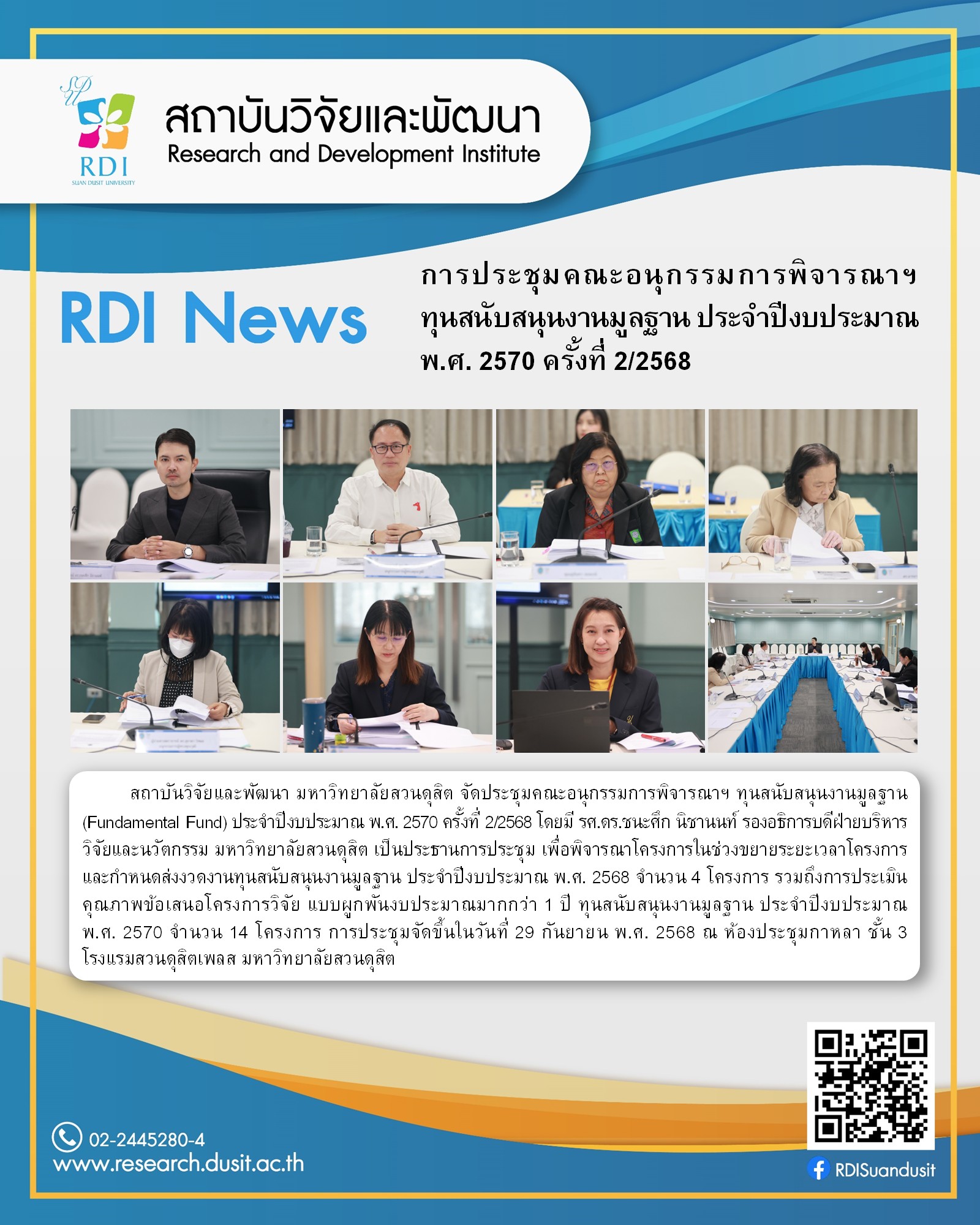 สถาบันวิจัยและพัฒนา มหาวิทยาลัยสวนดุสิต จัดประชุมคณะอนุกรรมการพิจารณาฯ ทุนสนับสนุนงานมูลฐาน(Fundamental Fund) ประจำปีงบประมาณ พ.ศ. 2570 ครั้งที่ 2/2568 โดยมี รศ.ดร.ชนะศึก นิชานนท์ รองอธิการบดีฝ่ายบริหาร วิจัยและนวัตกรรม มหาวิทยาลัยสวนดุสิต เป็นประธานการประชุม เพื่อพิจารณาโครงการในช่วงขยายระยะเวลาโครงการและกำหนดส่งงวดงานทุนสนับสนุนงานมูลฐาน ประจำปีงบประมาณ พ.ศ. 2568 จำนวน 4 โครงการ รวมถึงการประเมินคุณภาพข้อเสนอโครงการวิจัย แบบผูกพันงบประมาณมากกว่า 1 ปี ทุนสนับสนุนงานมูลฐาน ประจำปีงบประมาณ พ.ศ. 2570 จำนวน 14 โครงการ การประชุมจัดขึ้นในวันที่ 29 กันยายน พ.ศ. 2568 ณ ห้องประชุมกาหลา ชั้น 3 โรงแรมสวนดุสิตเพลส มหาวิทยาลัยสวนดุสิต