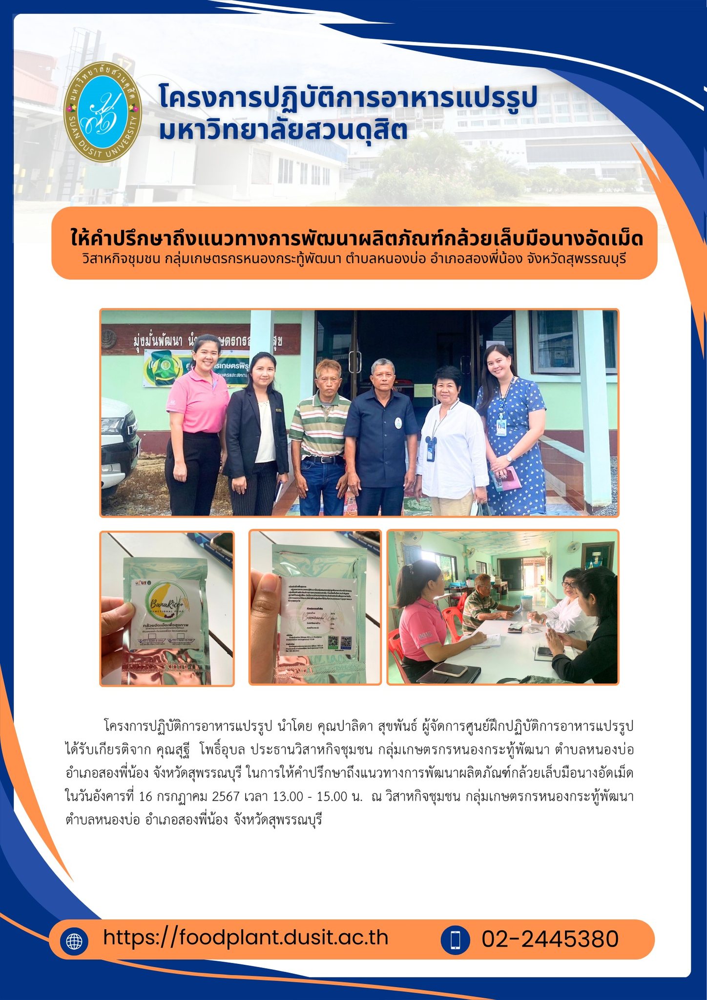 โครงการปฏิบัติการอาหารแปรรูป นำโดย คุณปาลิดา สุขพันธ์ ผู้จัดการศูนย์ฝึกปฏิบัติการอาหารแปรรูป ได้รับเกียรติจาก คุณสุฐี โพธิ์อุบล ประธานวิสาหกิจชุมชน กลุ่มเกษตรกรหนองกระทู้พัฒนา ตำบลหนองบ่อ อำเภอสองพี่น้อง จังหวัดสุพรรณบุรี ในการให้คำปรึกษาแนวทางการพัฒนาผลิตภัณฑ์กล้วยเล็บมือนางอัดเม็ด ในวันอังคารที่ 16 กรกฏาคม 2567 เวลา 13.00 - 15.00 น. ณ วิสาหกิจชุมชน กลุ่มเกษตรกรหนองกระทู้พัฒนา ตำบลหนองบ่อ อำเภอสองพี่น้อง จังหวัดสุพรรณบุรี