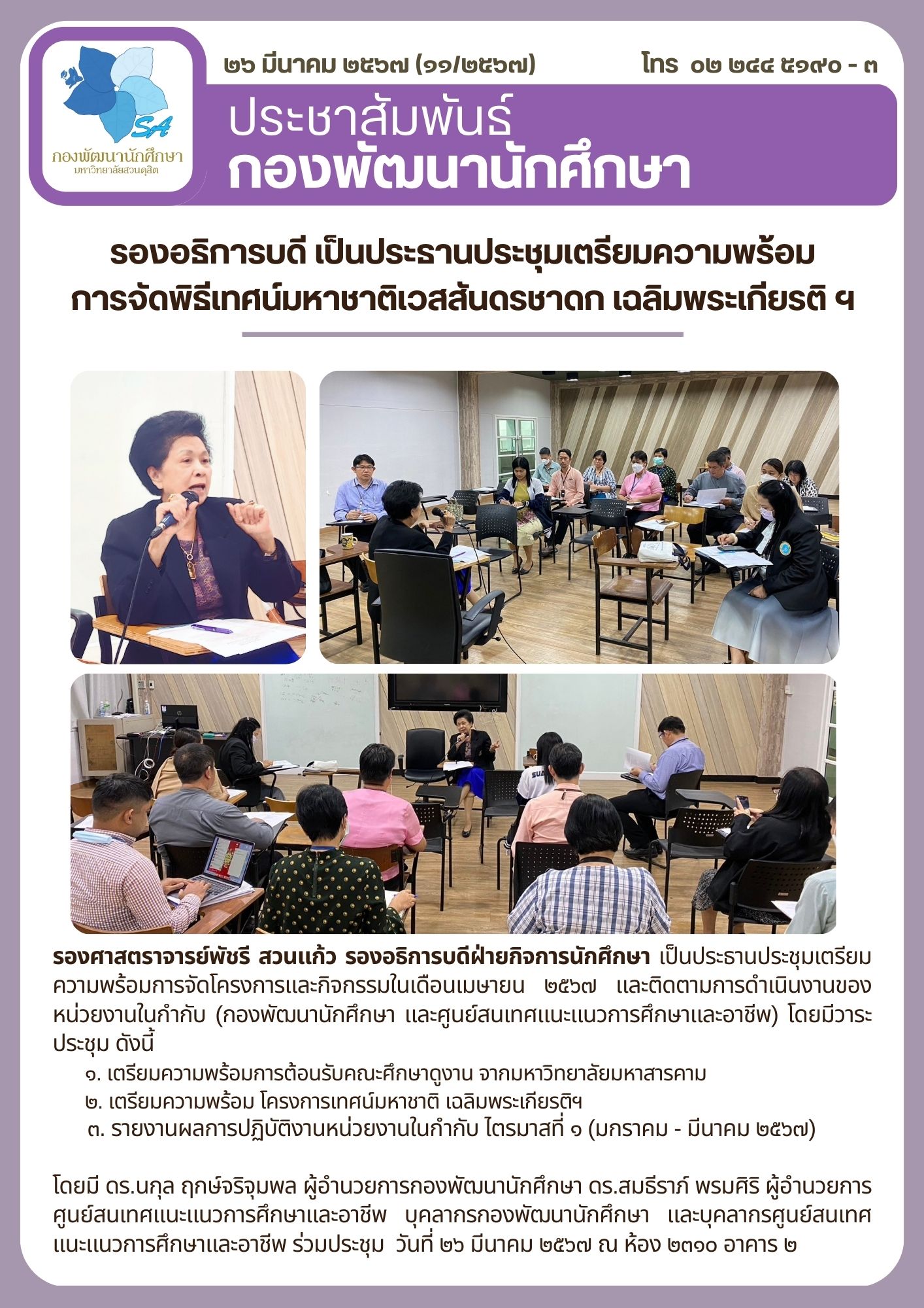 รองศาสตราจารย์พัชรี สวนแก้ว รองอธิการบดีฝ่ายกิจการนักศึกษา เป็นประธานประชุมเตรียมความพร้อมการจัดโครงการและกิจกรรมในเดือนเมษายน ๒๕๖๗ และติดตามการดำเนินงานของหน่วยงานในกำกับ (กองพัฒนานักศึกษา และศูนย์สนเทศแนะแนวการศึกษาและอาชีพ) โดยมีวาระประชุม ดังนี้ ๑. เตรียมความพร้อมการต้อนรับคณะศึกษาดูงาน จากมหาวิทยาลัยมหาสารคาม ๒. เตรียมความพร้อม โครงการเทศน์มหาชาติ เฉลิมพระเกียรติฯ ๓. รายงานผลการปฏิบัติงานหน่วยงานในกำกับ ไตรมาสที่ ๑ (มกราคม - มีนาคม ๒๕๖๗) โดยมี ดร.นกุล ฤกษ์จริจุมพล ผู้อำนวยการกองพัฒนานักศึกษา ดร.สมธีราภ์ พรมศิริ ผู้อำนวยการศูนย์สนเทศแนะแนวการศึกษาและอาชีพ บุคลากรกองพัฒนานักศึกษา และบุคลากรศูนย์สนเทศแนะแนวการศึกษาและอาชีพ ร่วมประชุม วันที่ ๒๖ มีนาคม ๒๕๖๗ ณ ห้อง ๒๓๑๐ อาคาร ๒