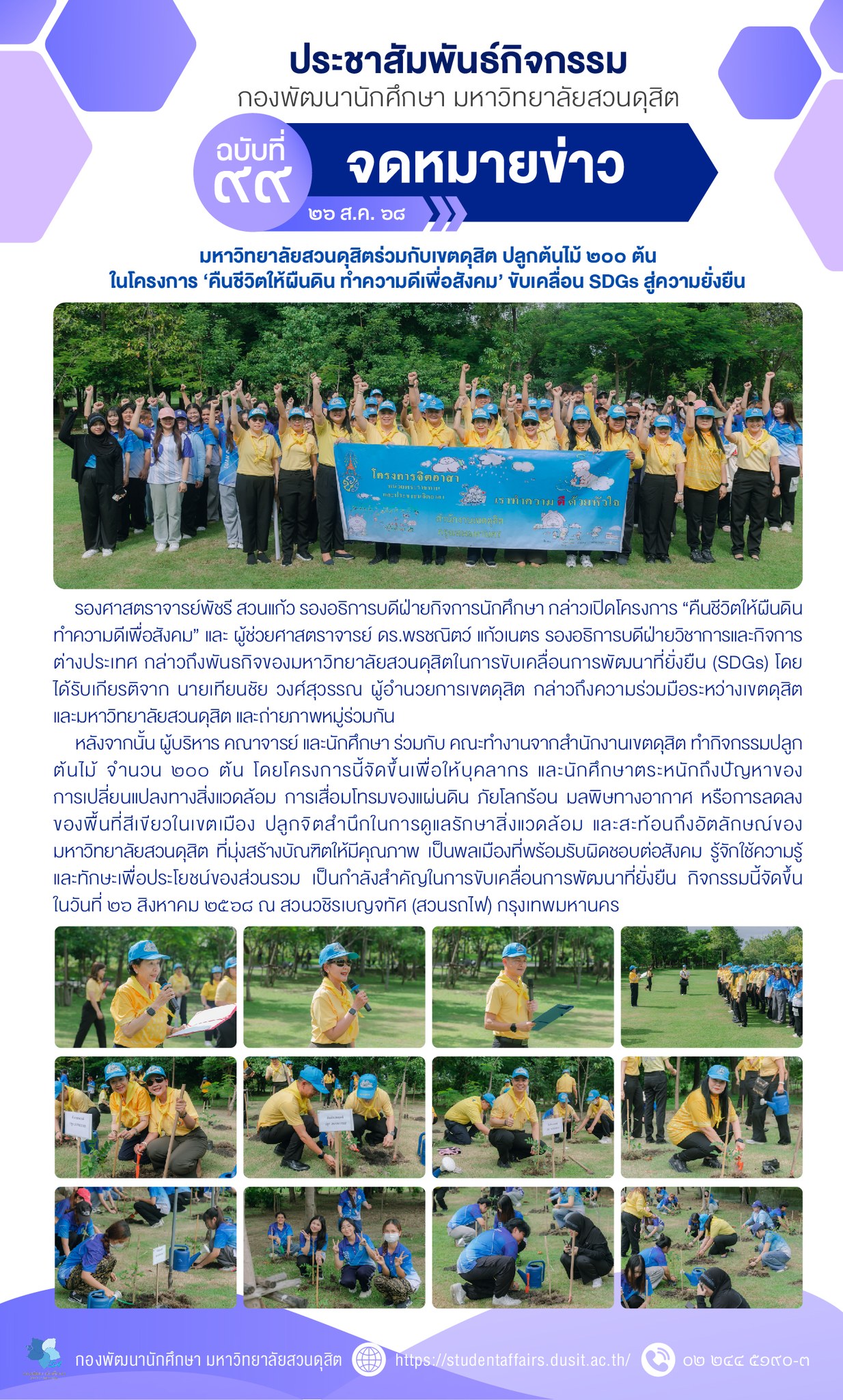 มหาวิทยาลัยสวนดุสิตร่วมกับเขตดุสิต ปลูกต้นไม้ ๒๐๐ ต้น ในโครงการ ‘คืนชีวิตให้แผ่นดิน ทำความดีเพื่อสังคม’ ขับเคลื่อน SDGs สู่ความยั่งยืน